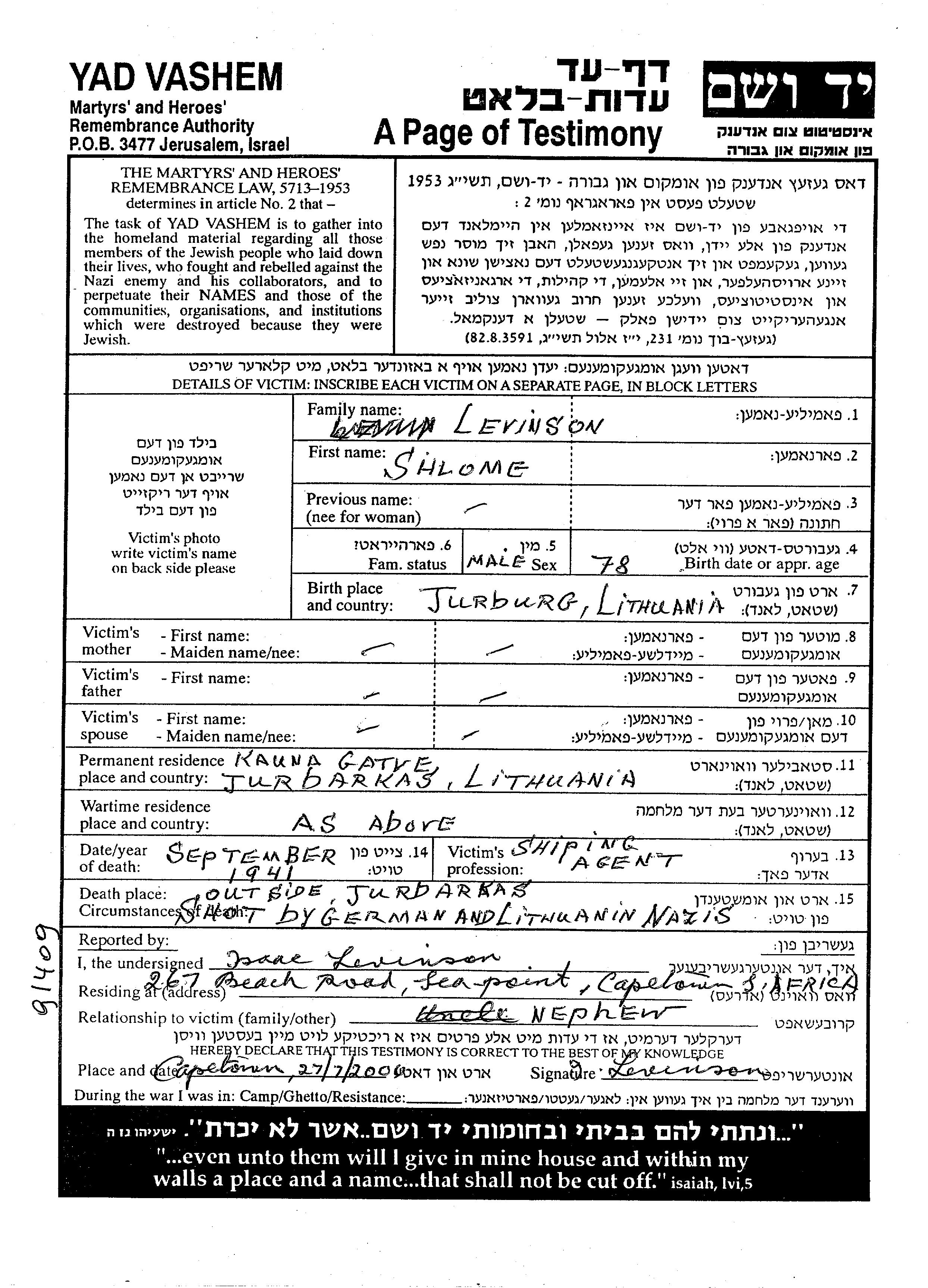 Levinson Shlome Jurbarkas, Lituanie Feuille de témoignage