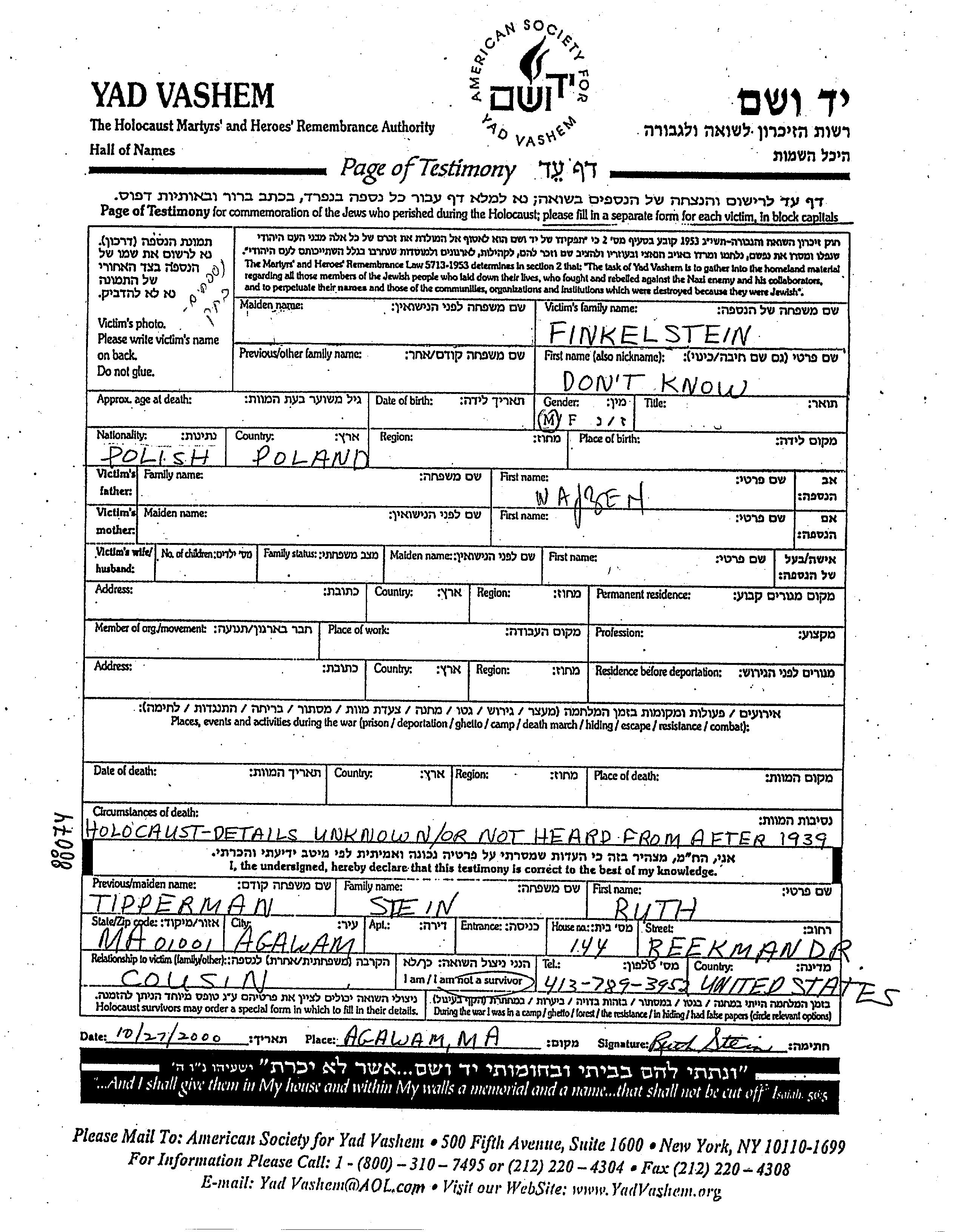 Finkelstein prénom inconnu endroit inconnu, Feuille de témoignage