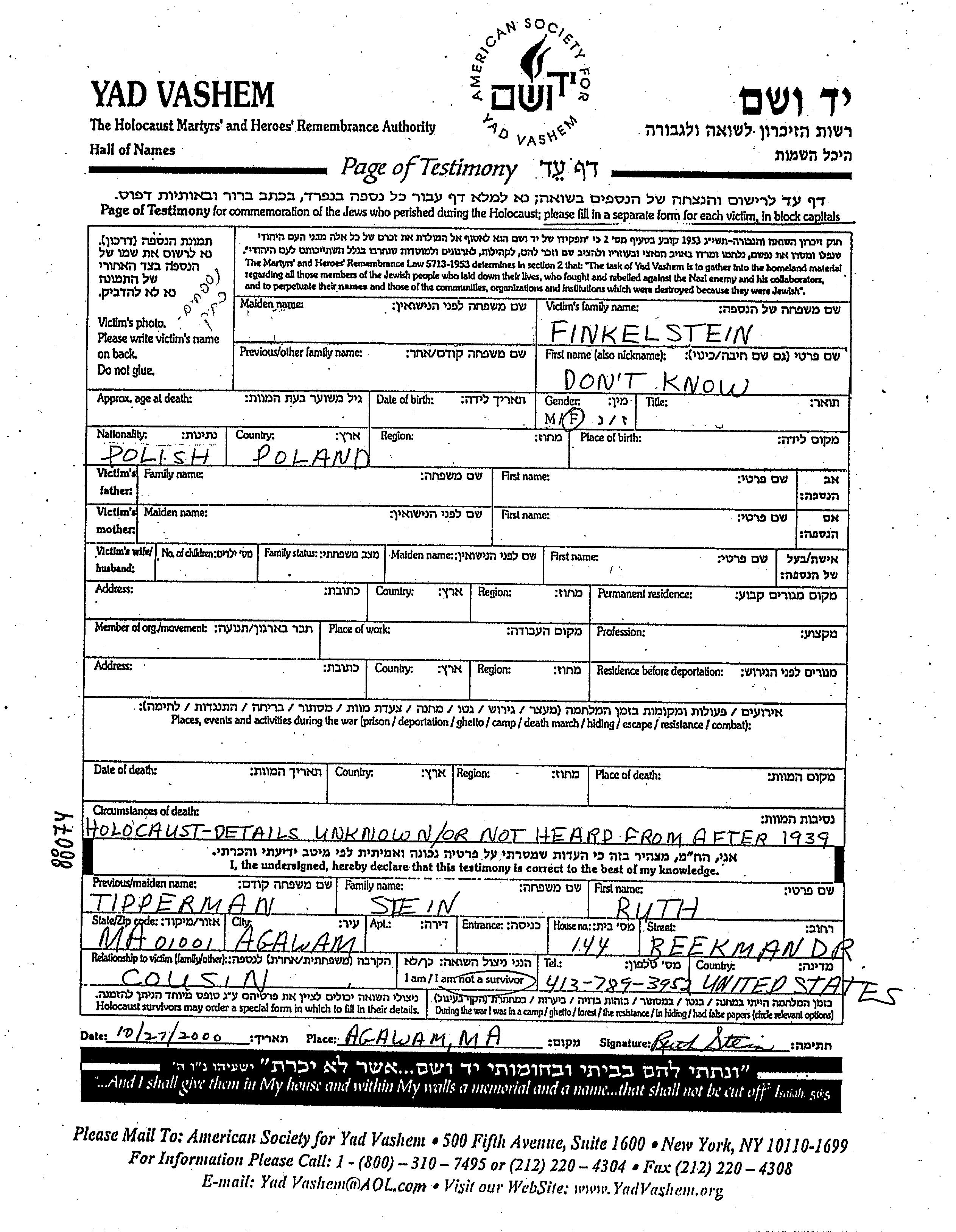 Finkelstein prénom inconnu endroit inconnu, Feuille de témoignage