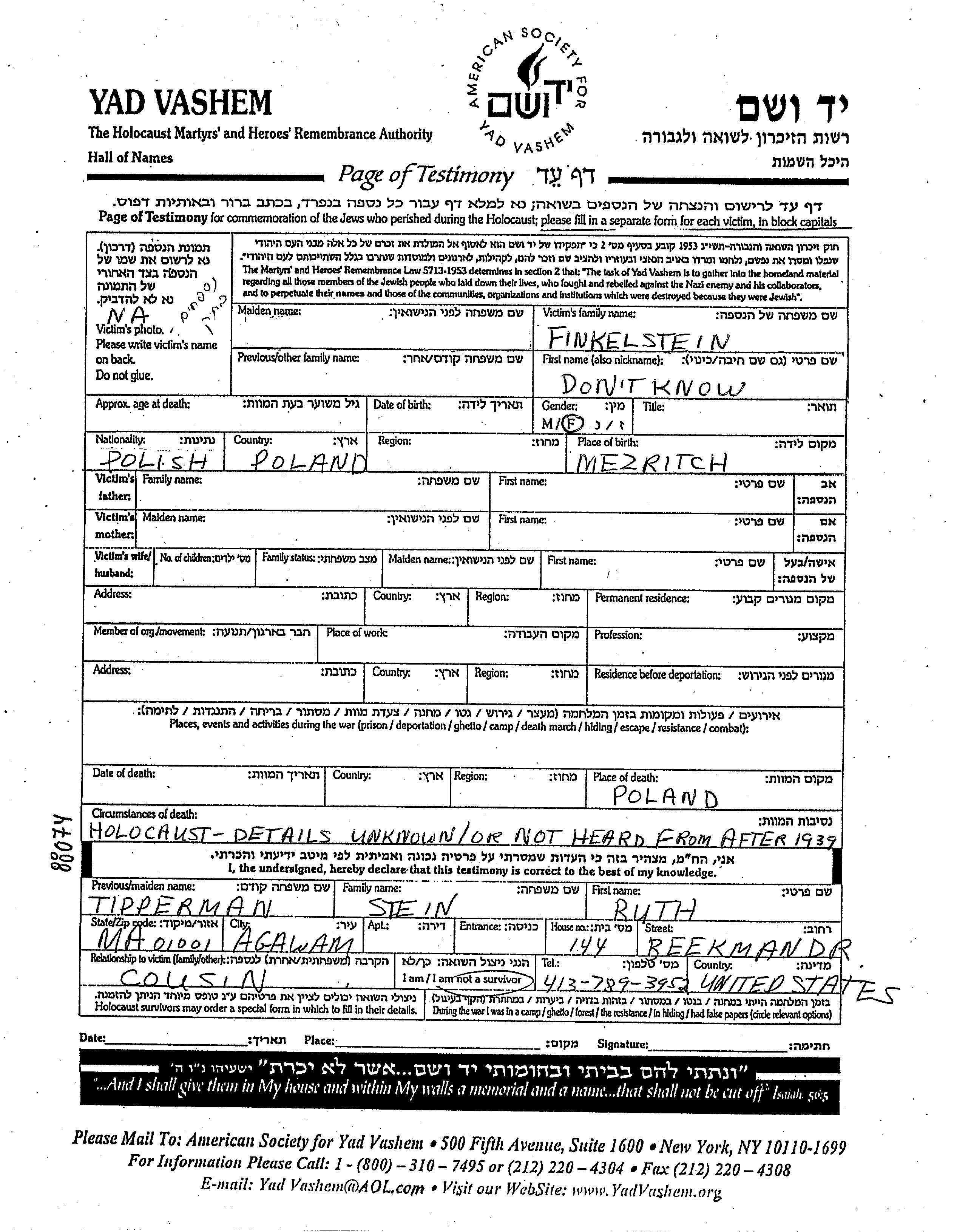 Finkelstein prénom inconnu endroit inconnu, Feuille de témoignage