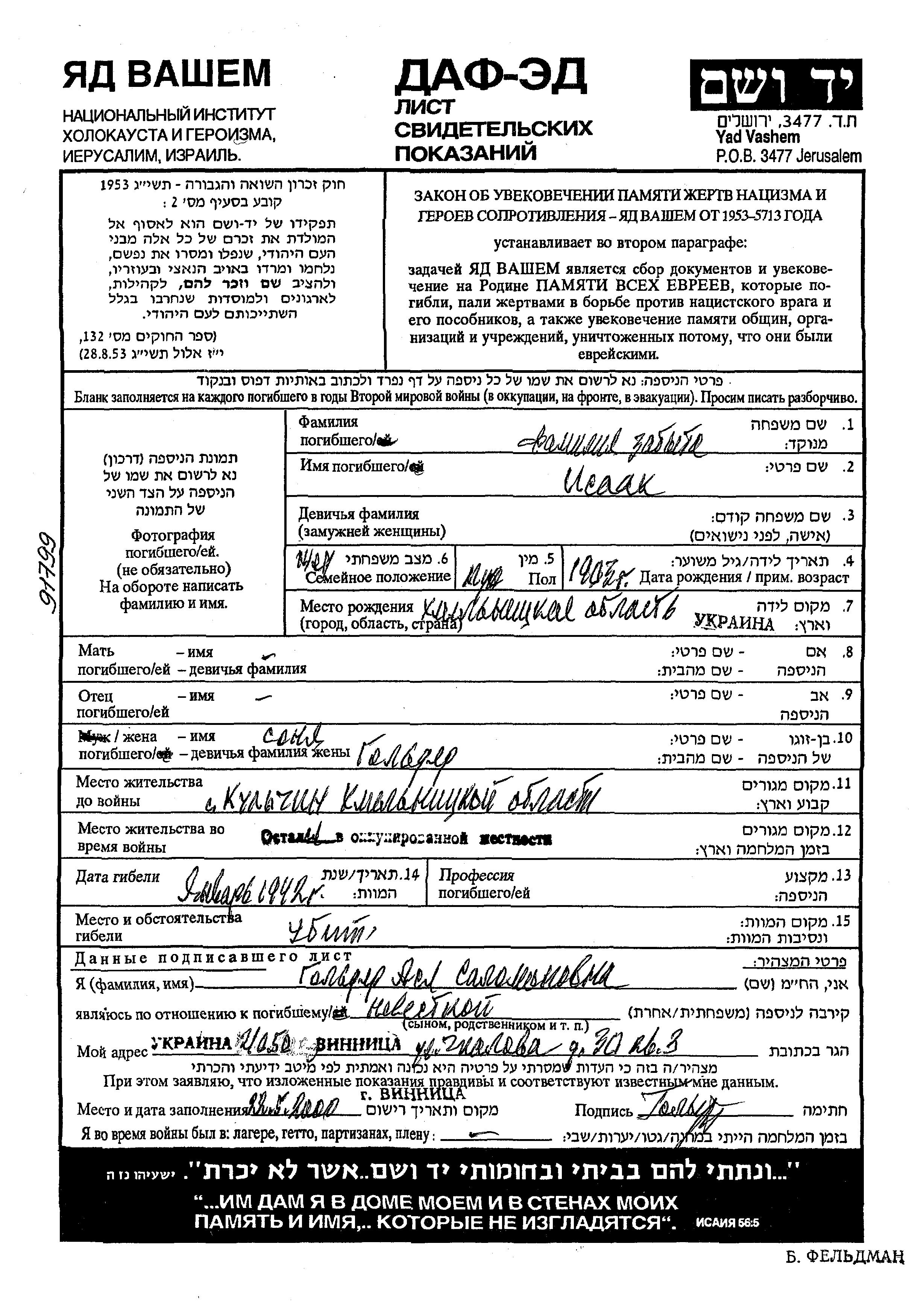 nom inconnu Isaak 1903 Kulchin, Ukraine (URSS) Feuille de témoignage