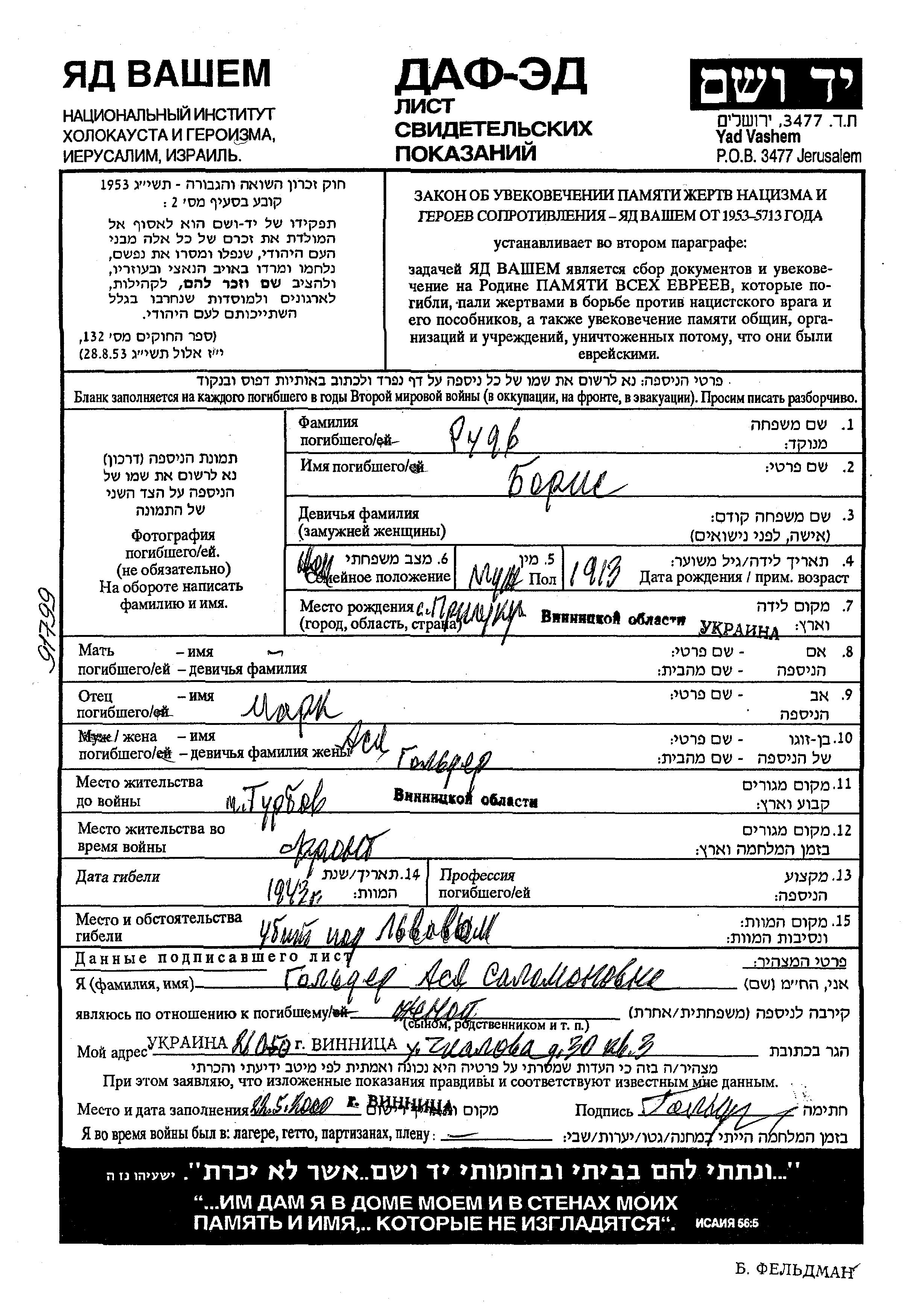 Yad Vashem - Pages of Testimony Names Memorial Collection