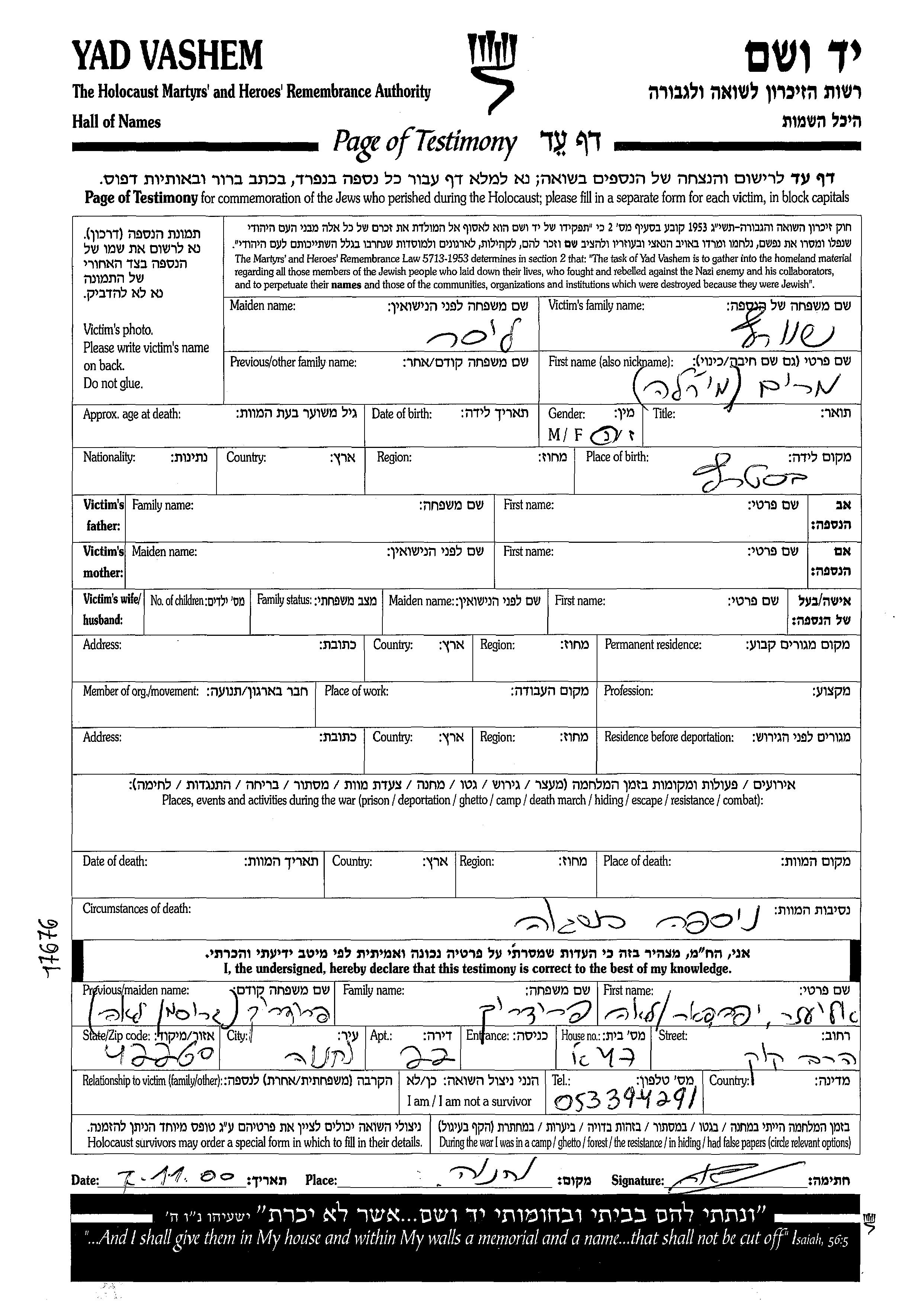 Shvartz Miriam endroit inconnu, Feuille de témoignage
