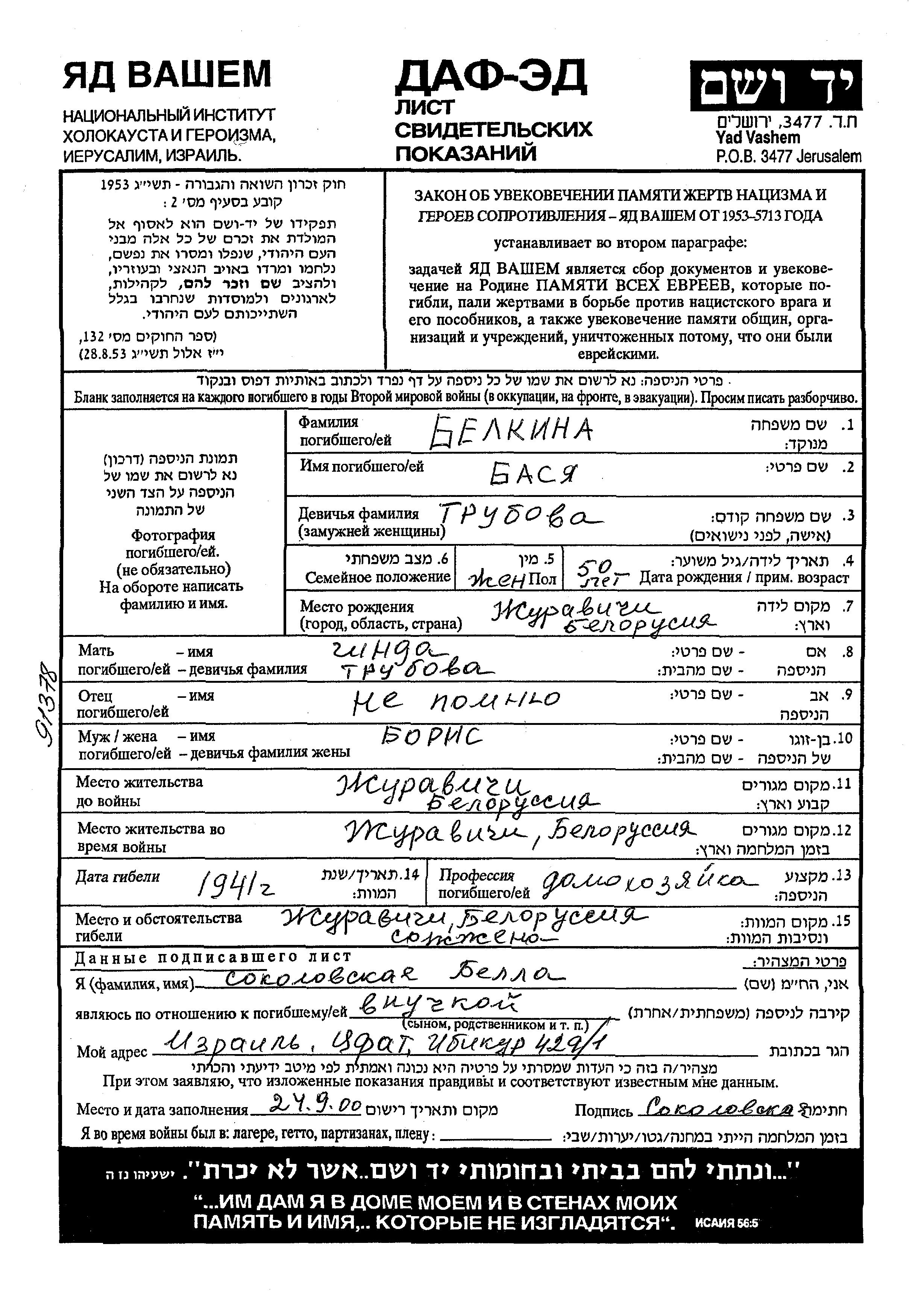 Belkina Basya Zhuravichi, Bélorussie (URSS) Feuille de témoignage
