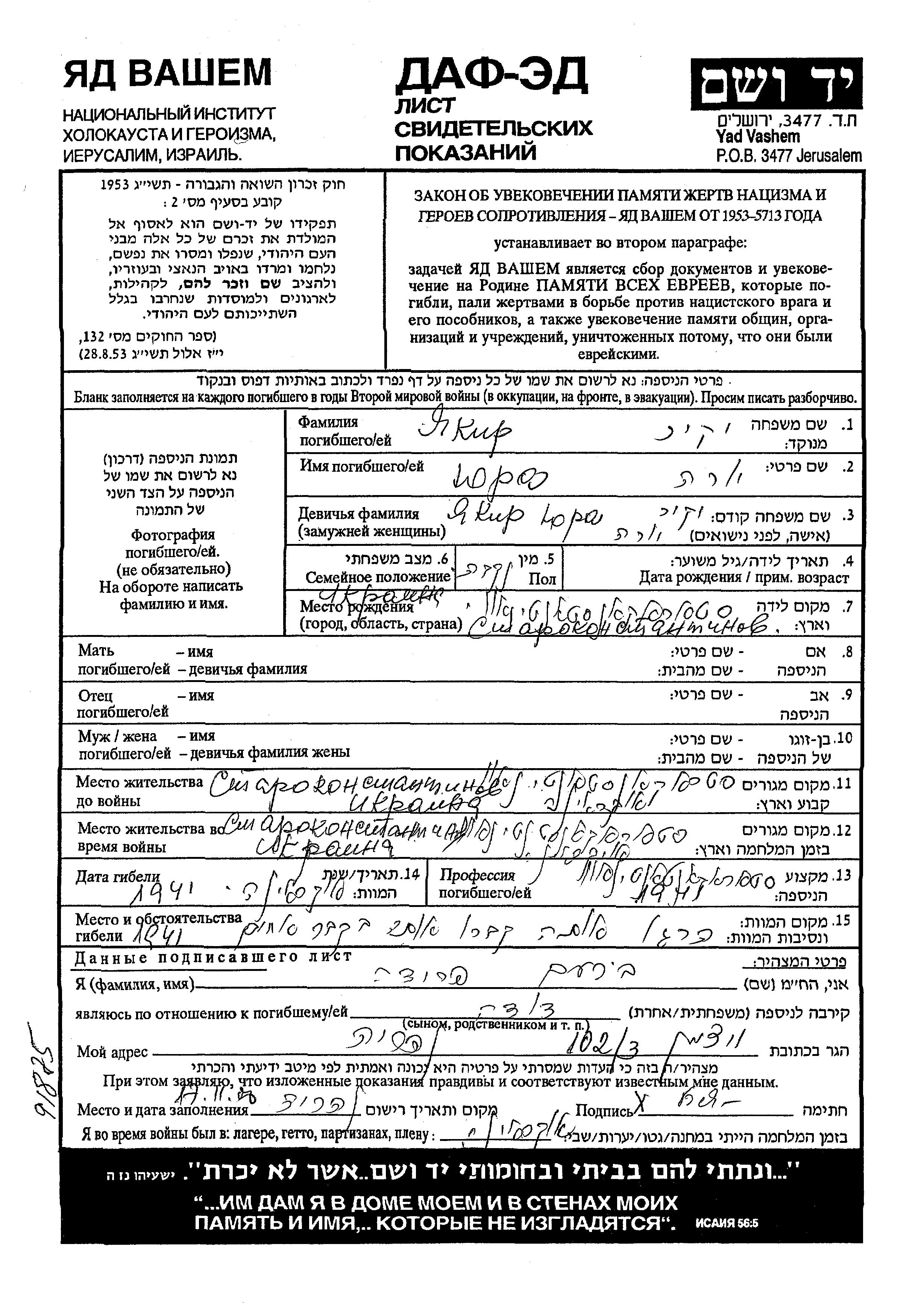 Yad Vashem - Pages of Testimony Names Memorial Collection