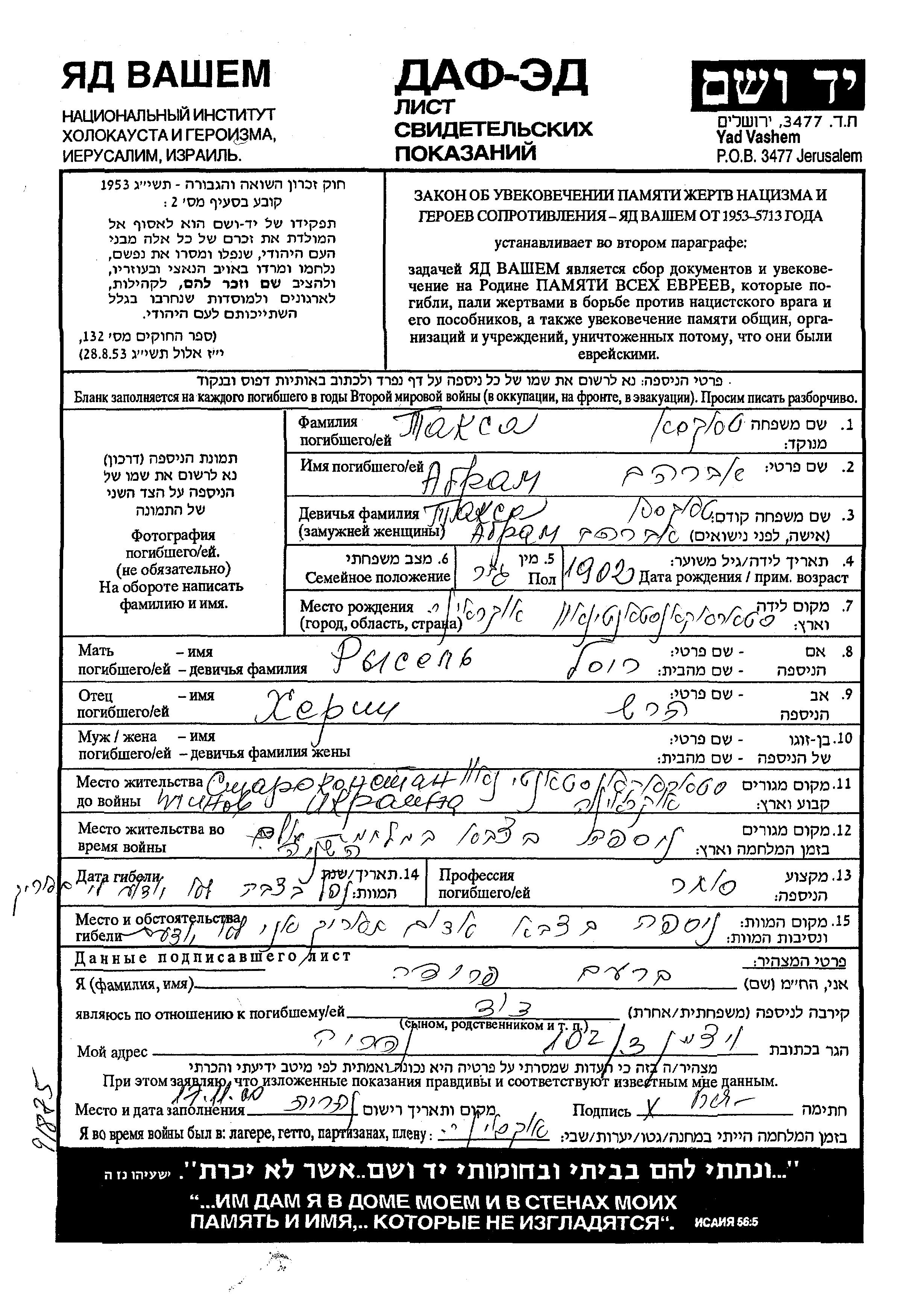 Taksa Abram 1902 Starokonstantinov, Ukraine (URSS) Feuille de témoignage