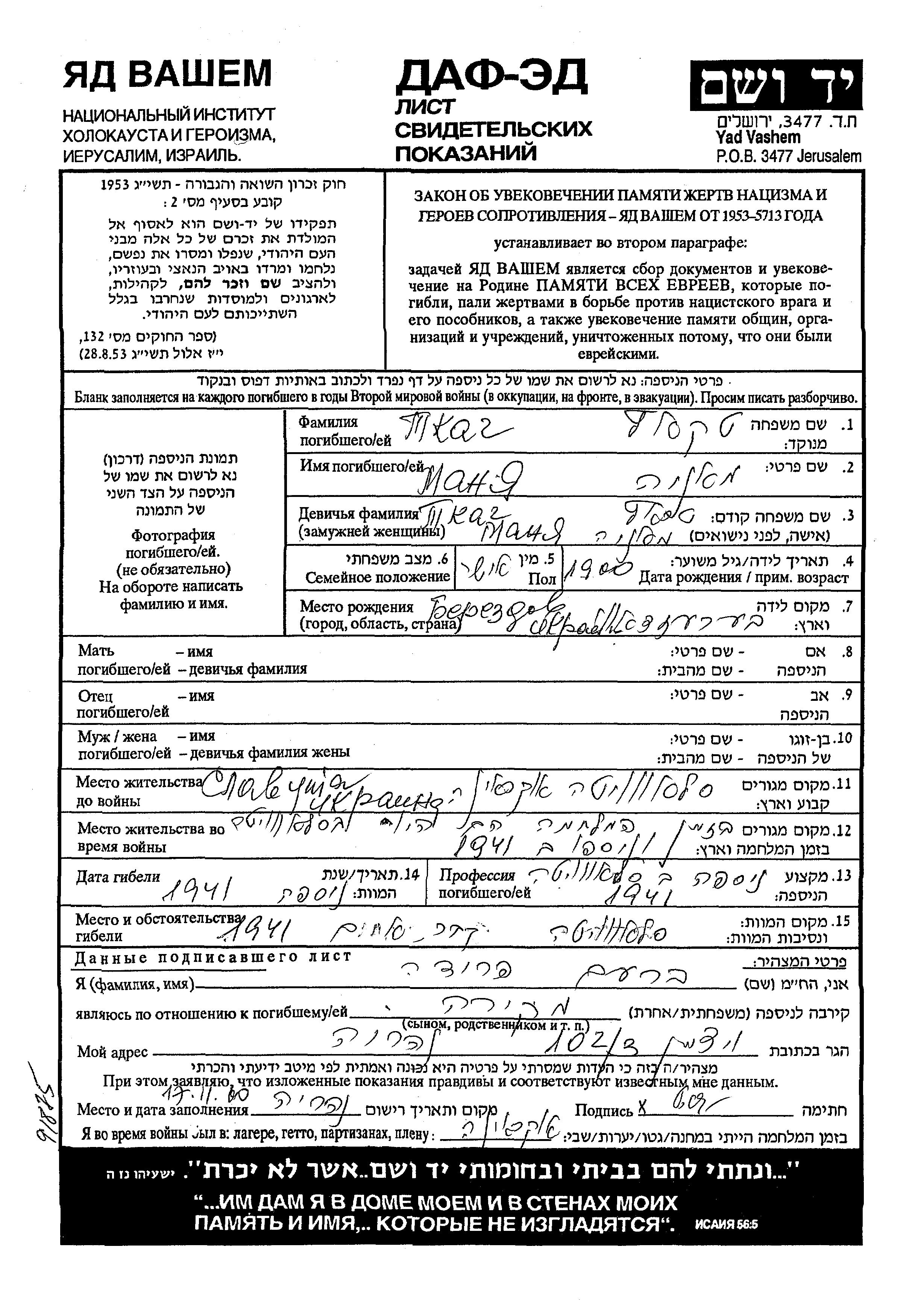 Yad Vashem - Pages of Testimony Names Memorial Collection