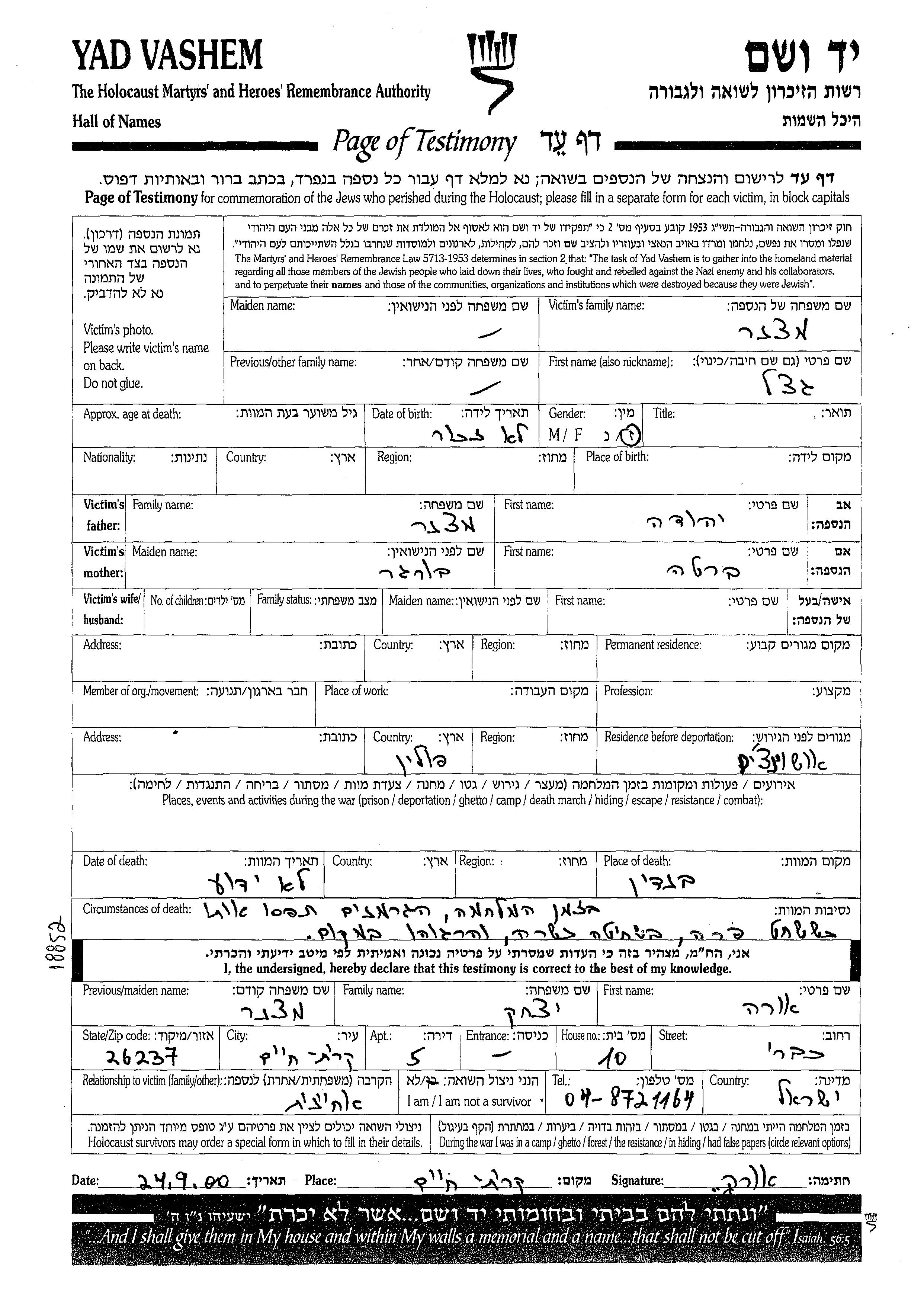 Lieu de résidence pendant la guerre/Shoah