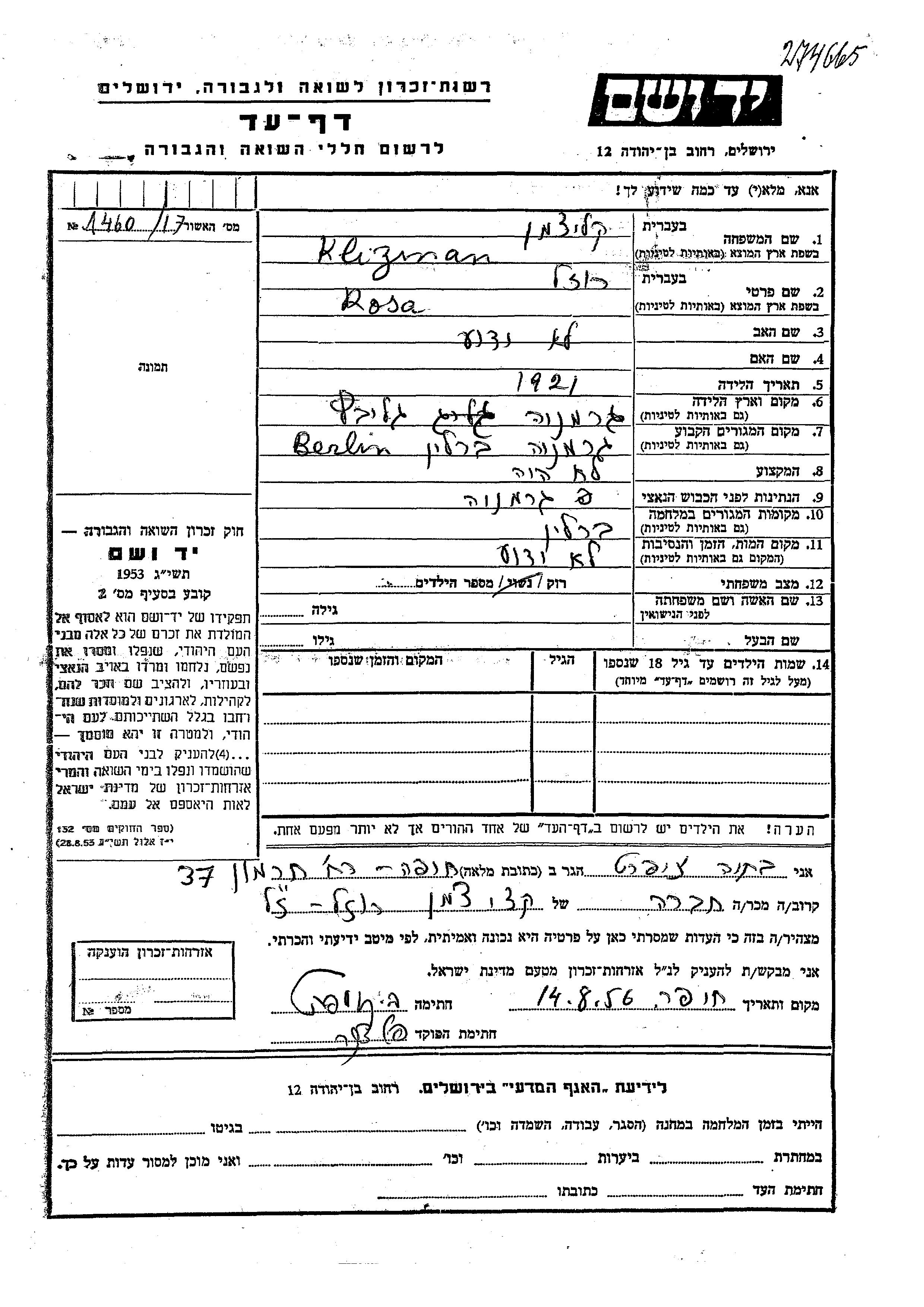 Klizman Klitzman Roza 1921 Berlin, Allemagne Feuille de témoignage