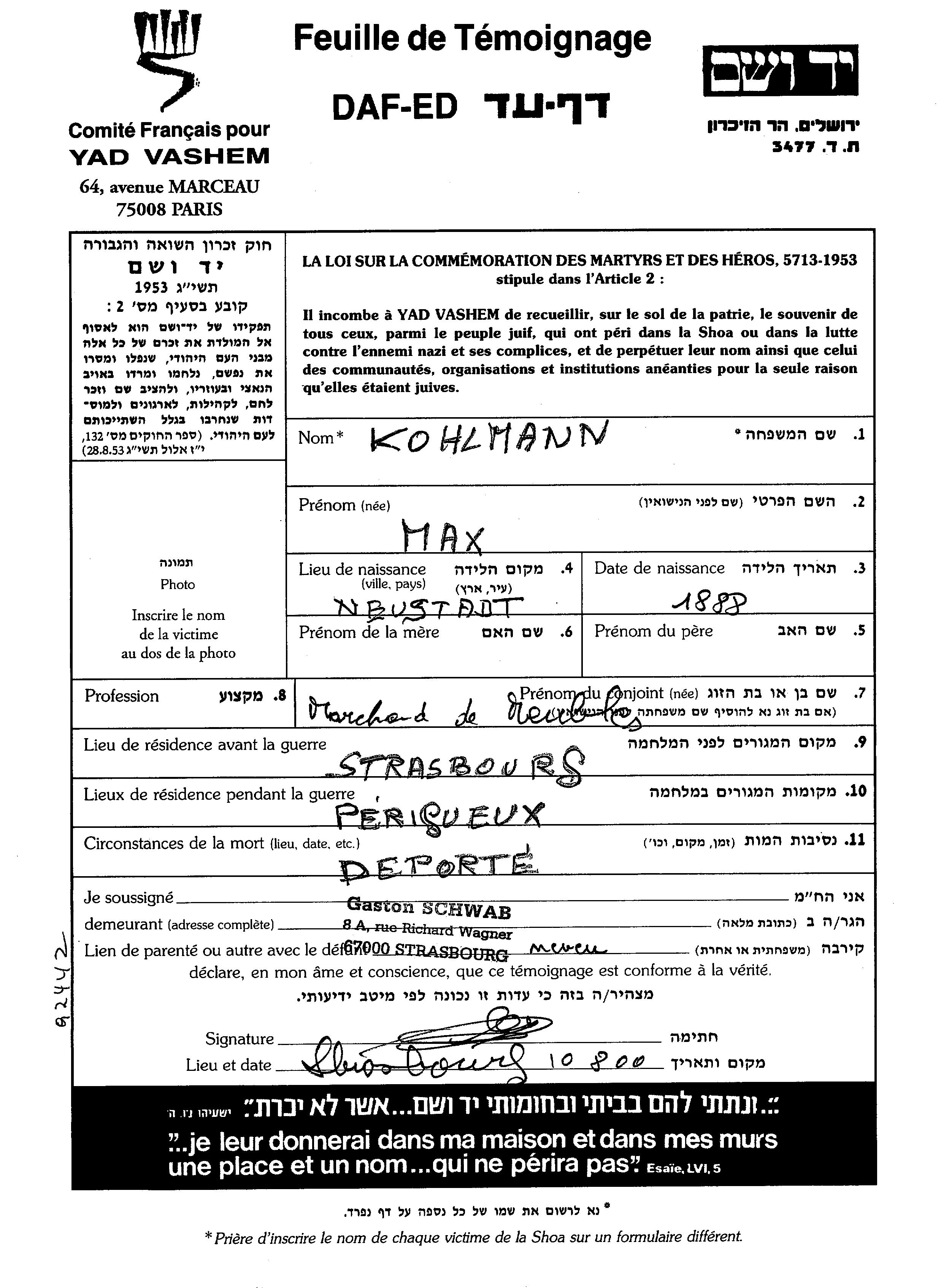 Max Kohlmann est né à Neustadt, Allemagne en 1888. Il était Marchand de meubles. Avant la seconde guerre mondiale il vivait à Strasbourg, France. Au cours de la guerre, il était à Périgueux, France.