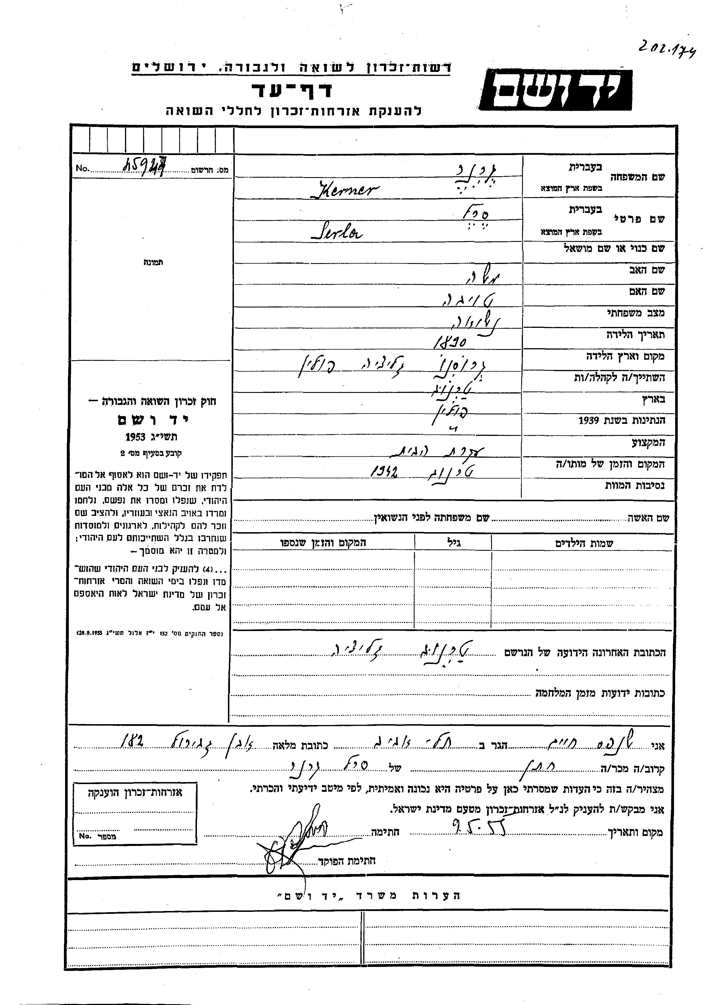 Serla a été assassinée pendant la Shoah. Lieu de la mort: Tarnow, Pologne en 1942.