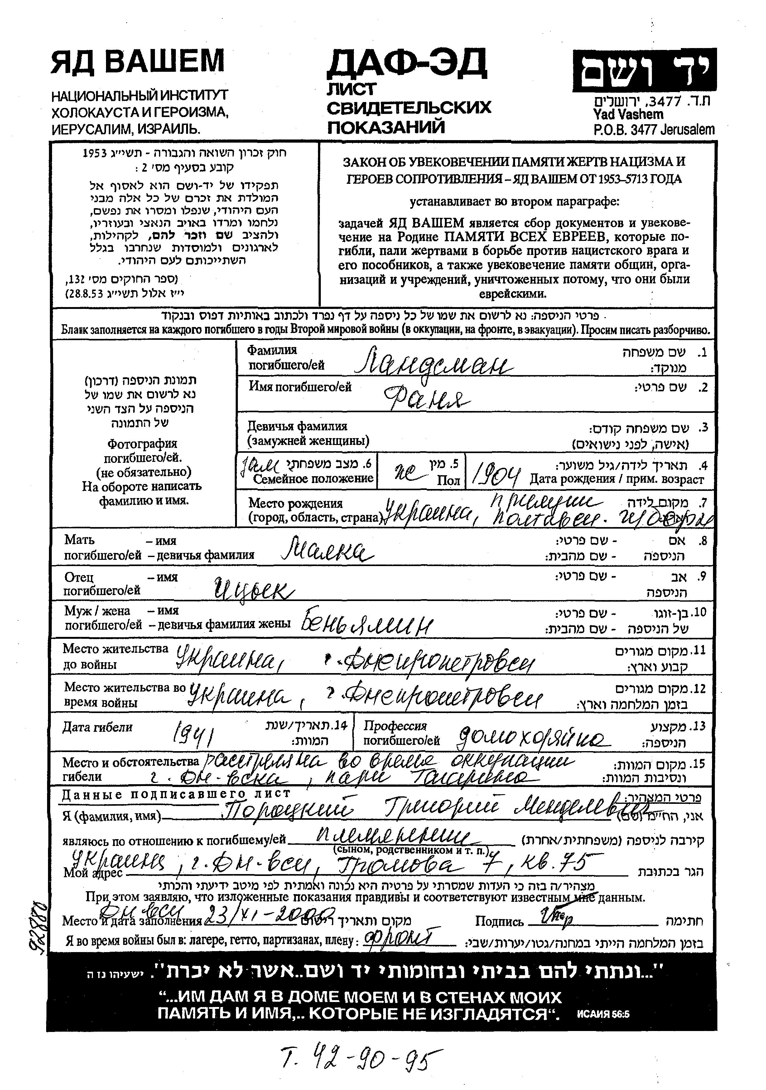 Yad Vashem - Pages of Testimony Names Memorial Collection
