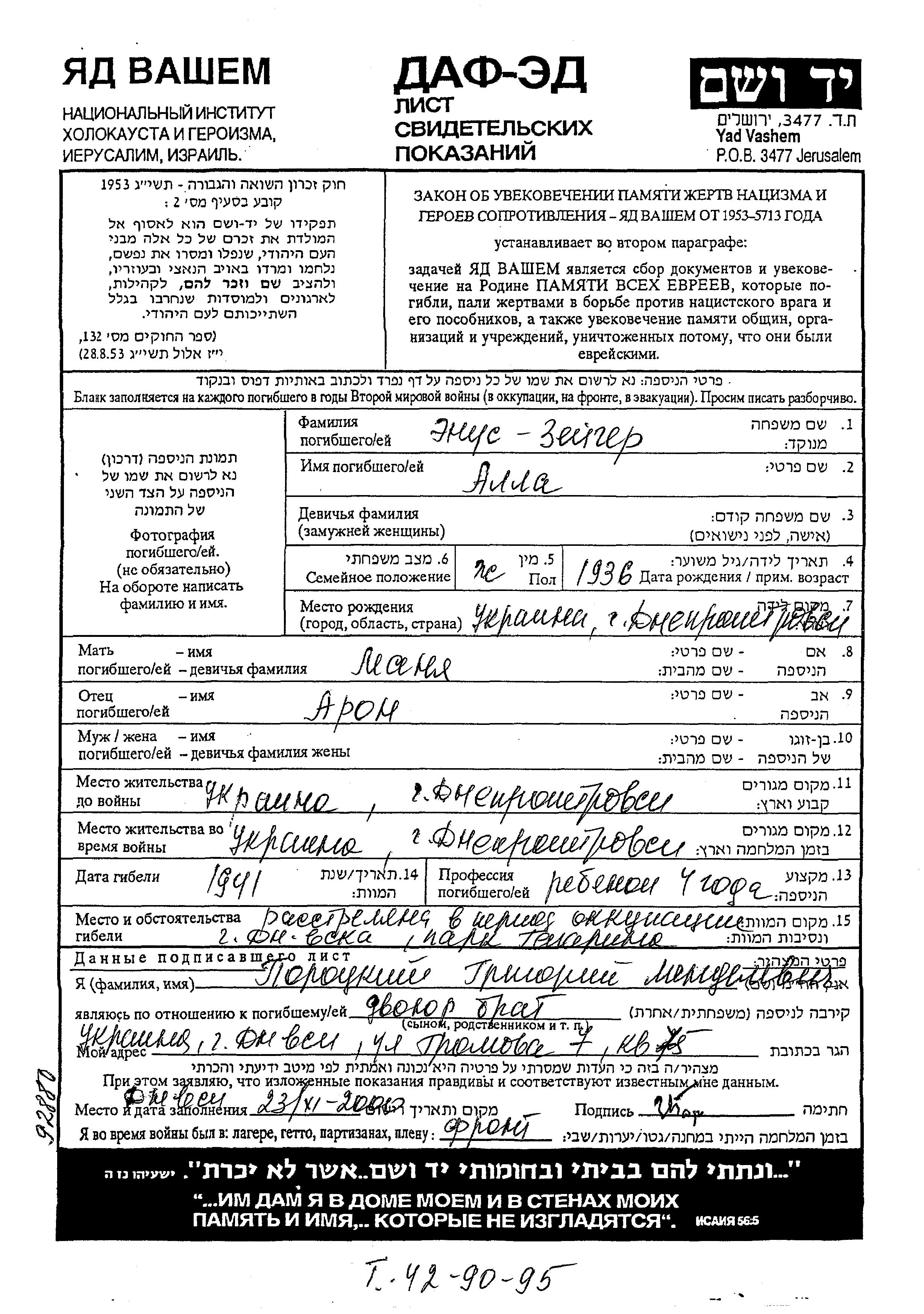 Enus Zeiger Alla 1936 Dnepropetrovsk, Ukraine (URSS) Feuille de témoignage