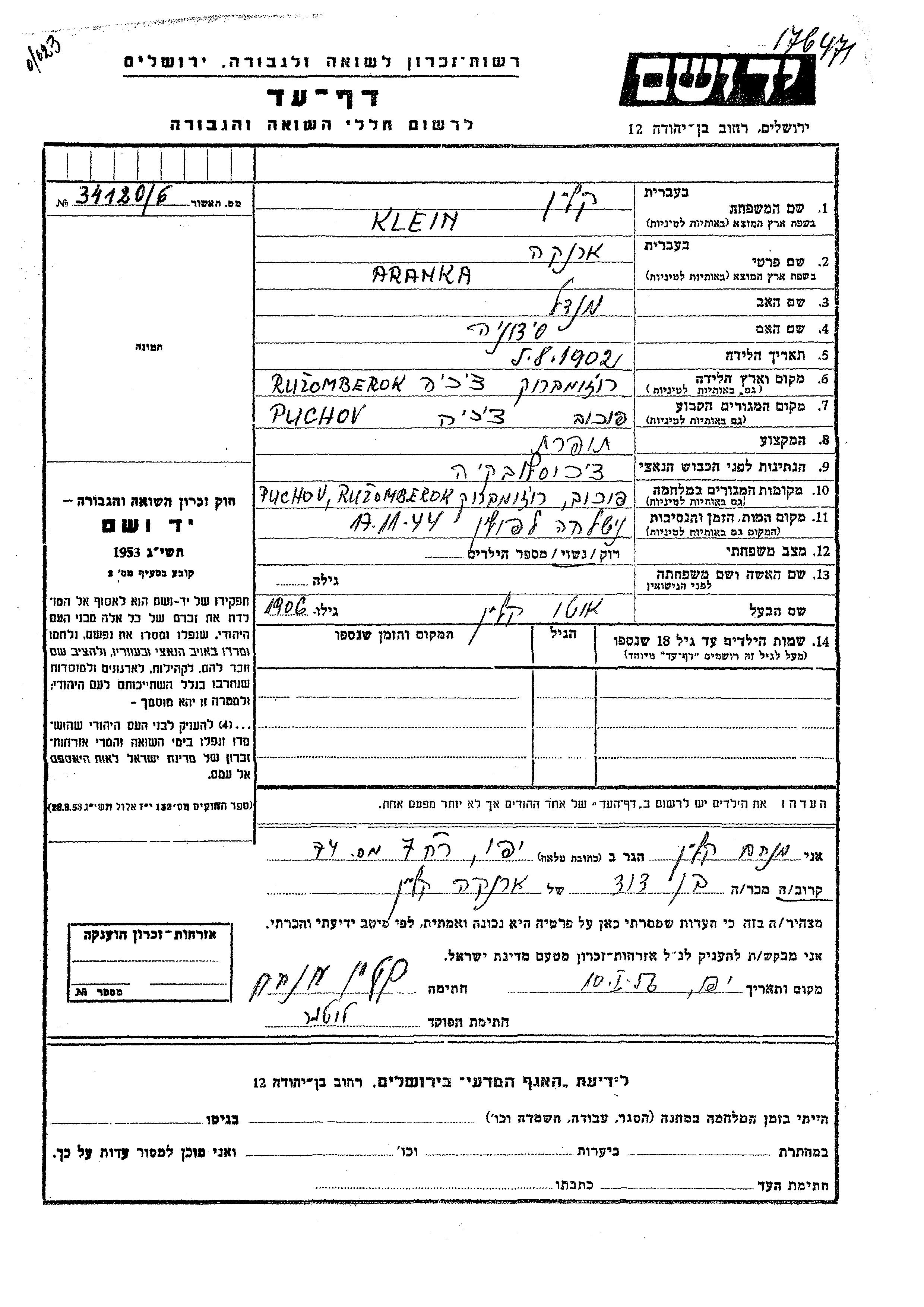 Klein Aranka 1902 Puchov, Tchécoslovaquie Feuille de témoignage