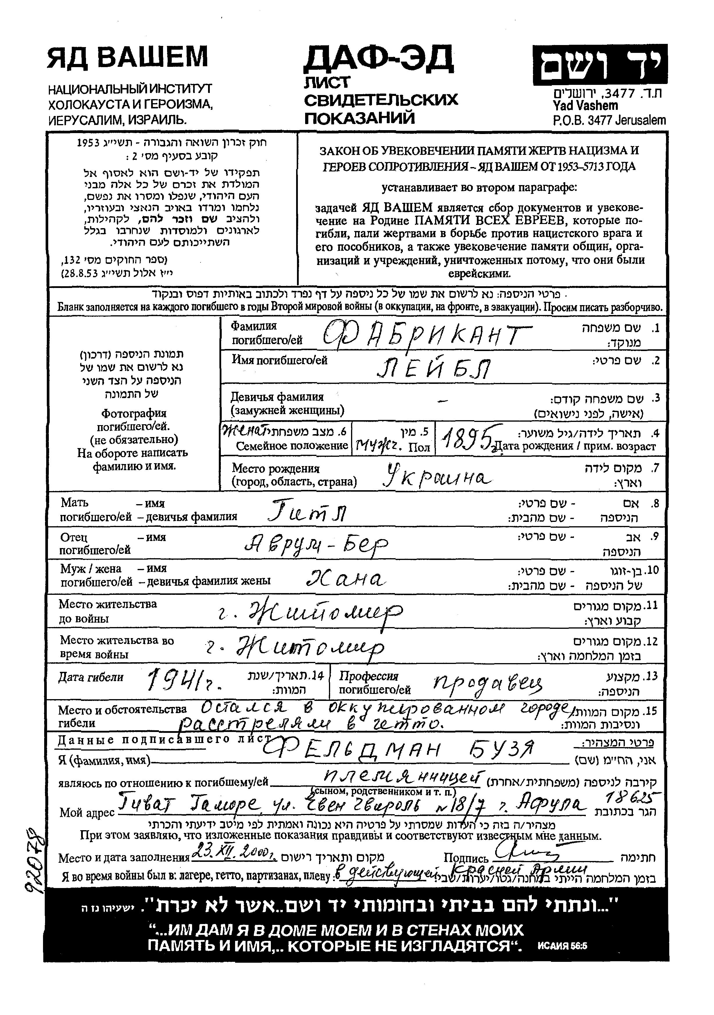 Yad Vashem - Pages of Testimony Names Memorial Collection