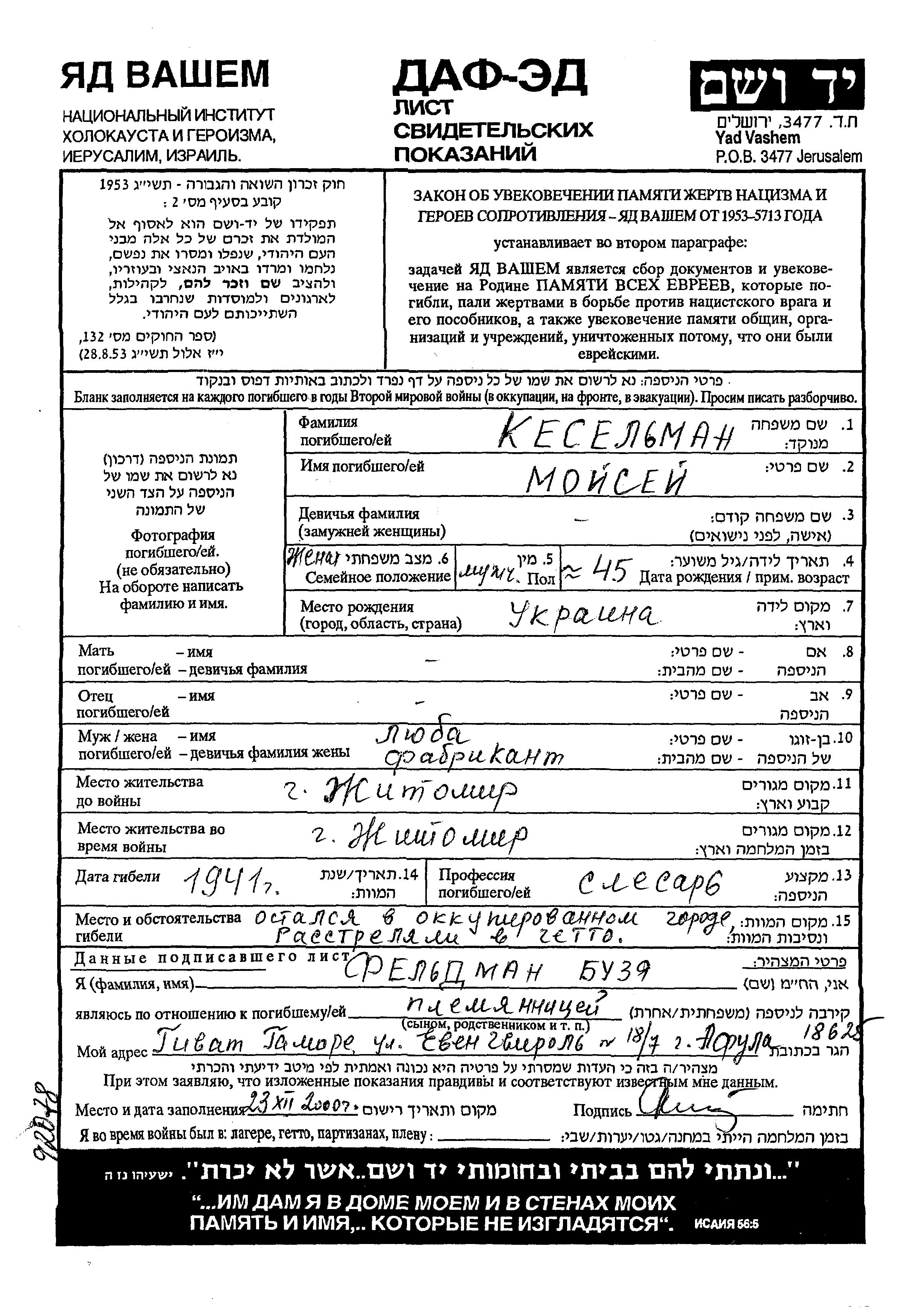 Keselman Moisei Zhitomir, Ukraine (URSS) Feuille de témoignage