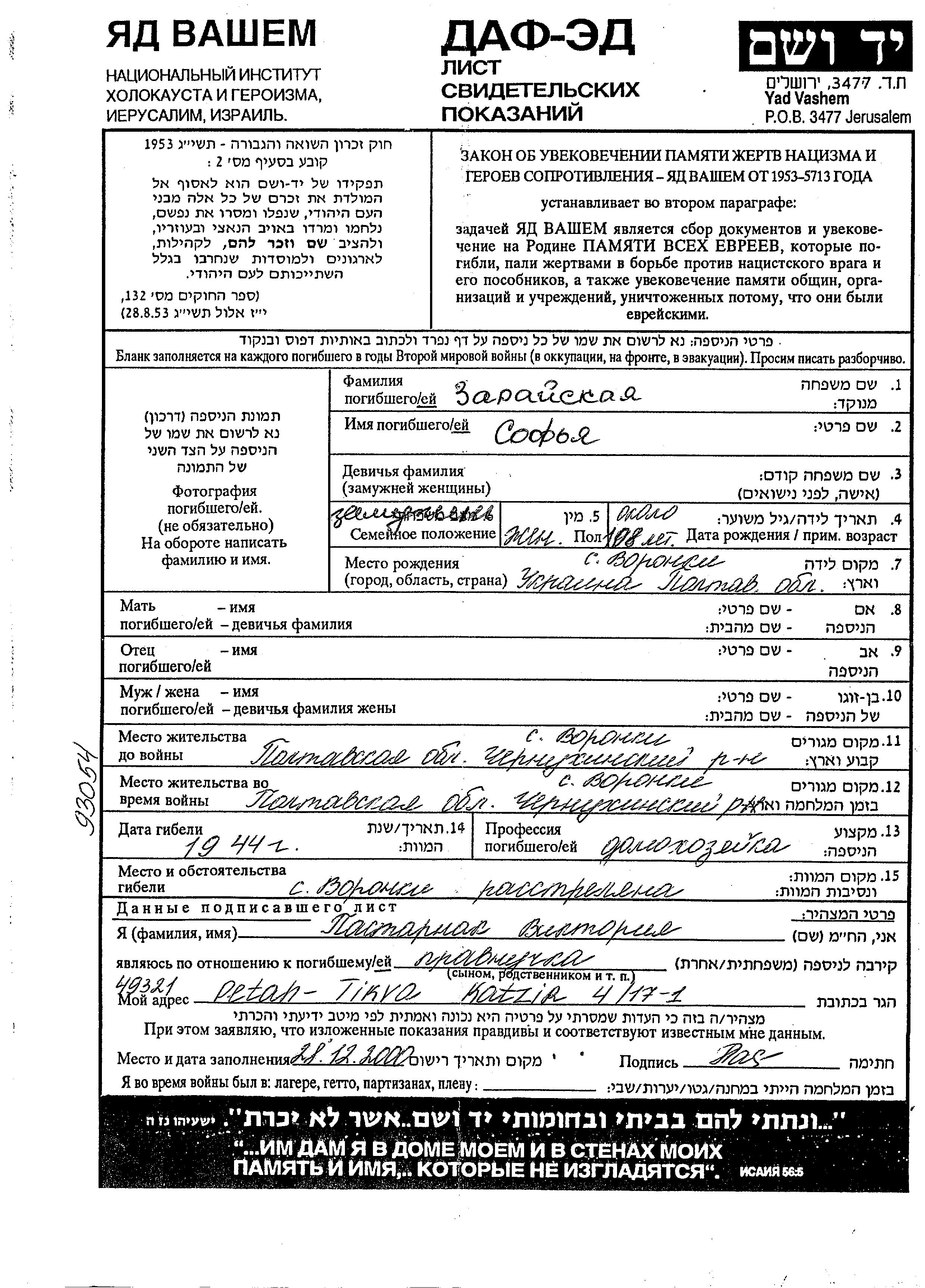 Zaraiskaya Sofia Voronki, Ukraine (URSS) Feuille de témoignage