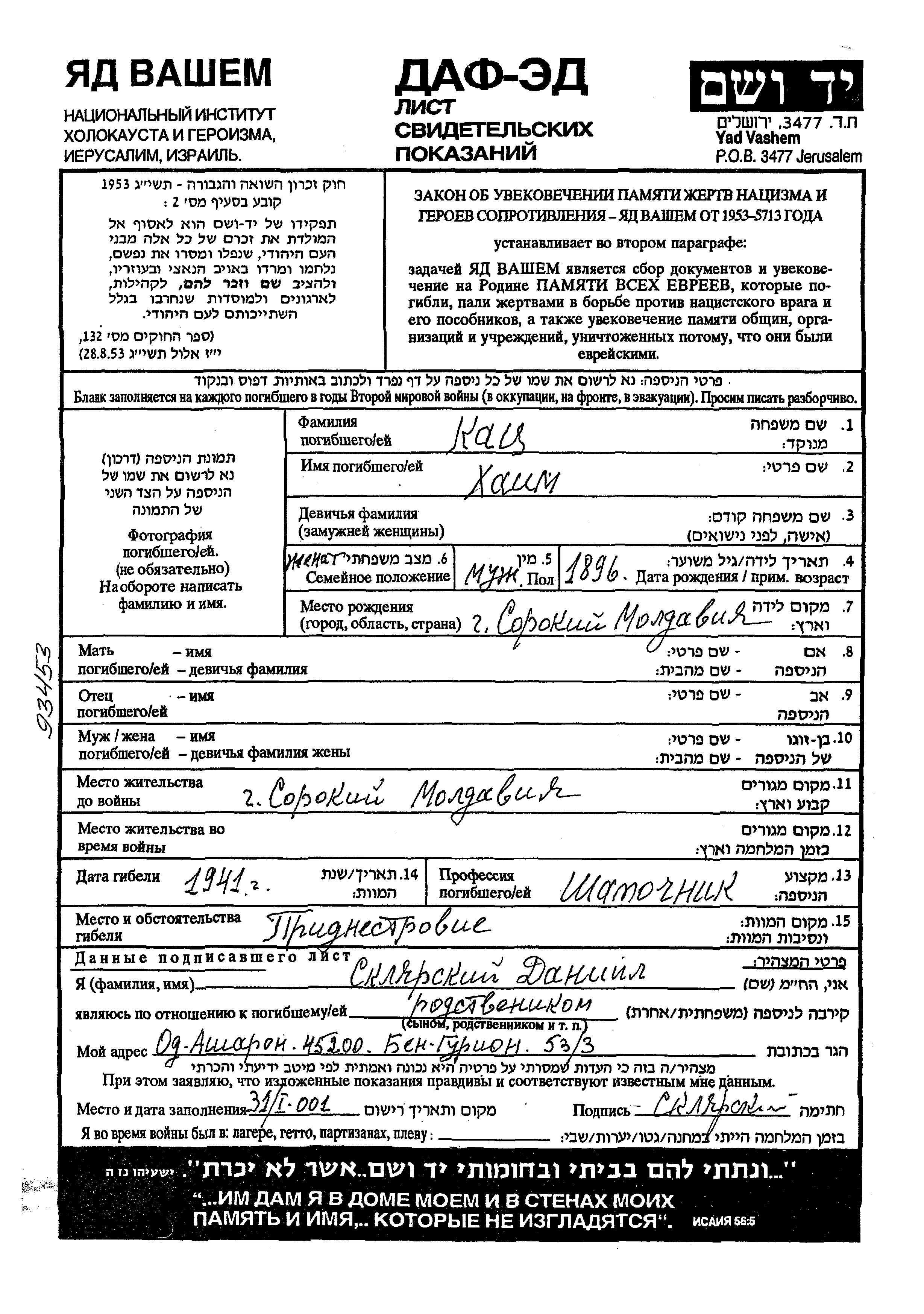 Khaim a été assassiné pendant la Shoah. Lieu de la mort: Moldavia, Roumanie en 1941.