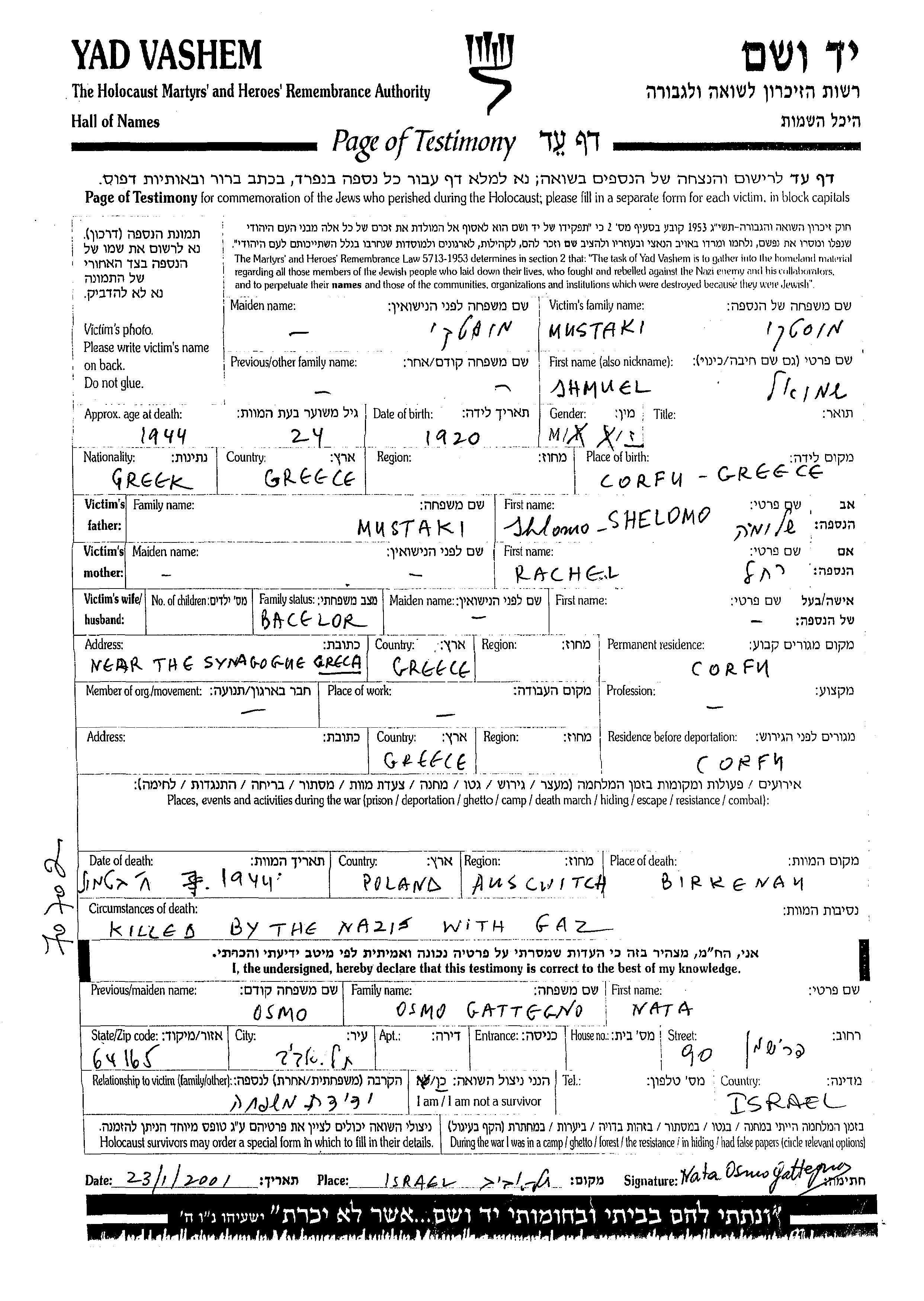 Mustaki Shmuel 1920 Corfu, Grèce Feuille de témoignage