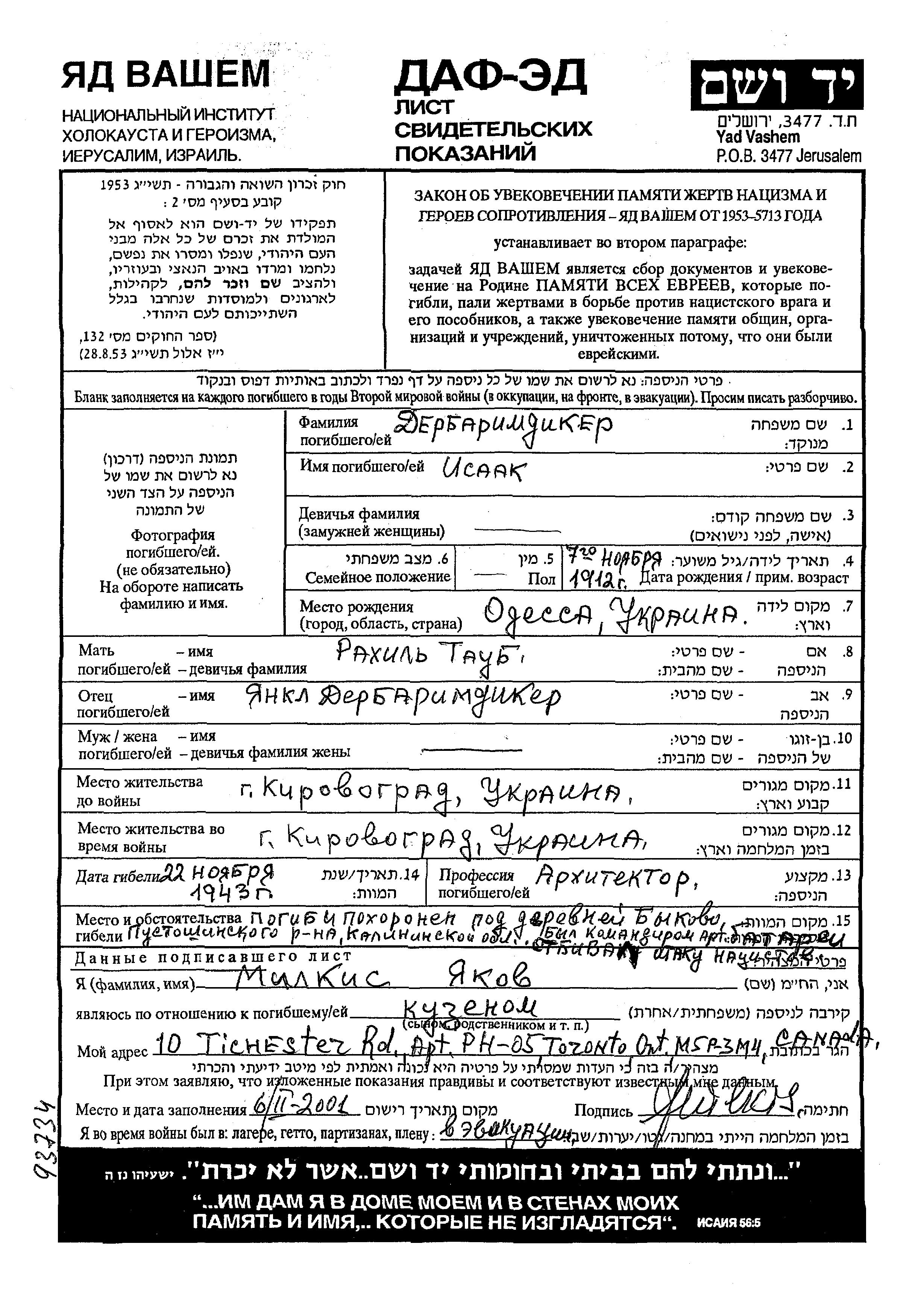 Isaak Derbarimdiker est né à Odessa, Ukraine (URSS) en 1912, fils de Yankl et de Rakhil née Taub. Il était Architecte. Avant la seconde guerre mondiale il vivait à Kirovograd, Ukraine (URSS). Au cours de la guerre, il était à the Soviet armed forces. Isaak a été tué en tant que militaire pendant la Seconde Guerre mondiale. Lieu de la mort: Kalinin, Russie (URSS) en 22/11/1943.
