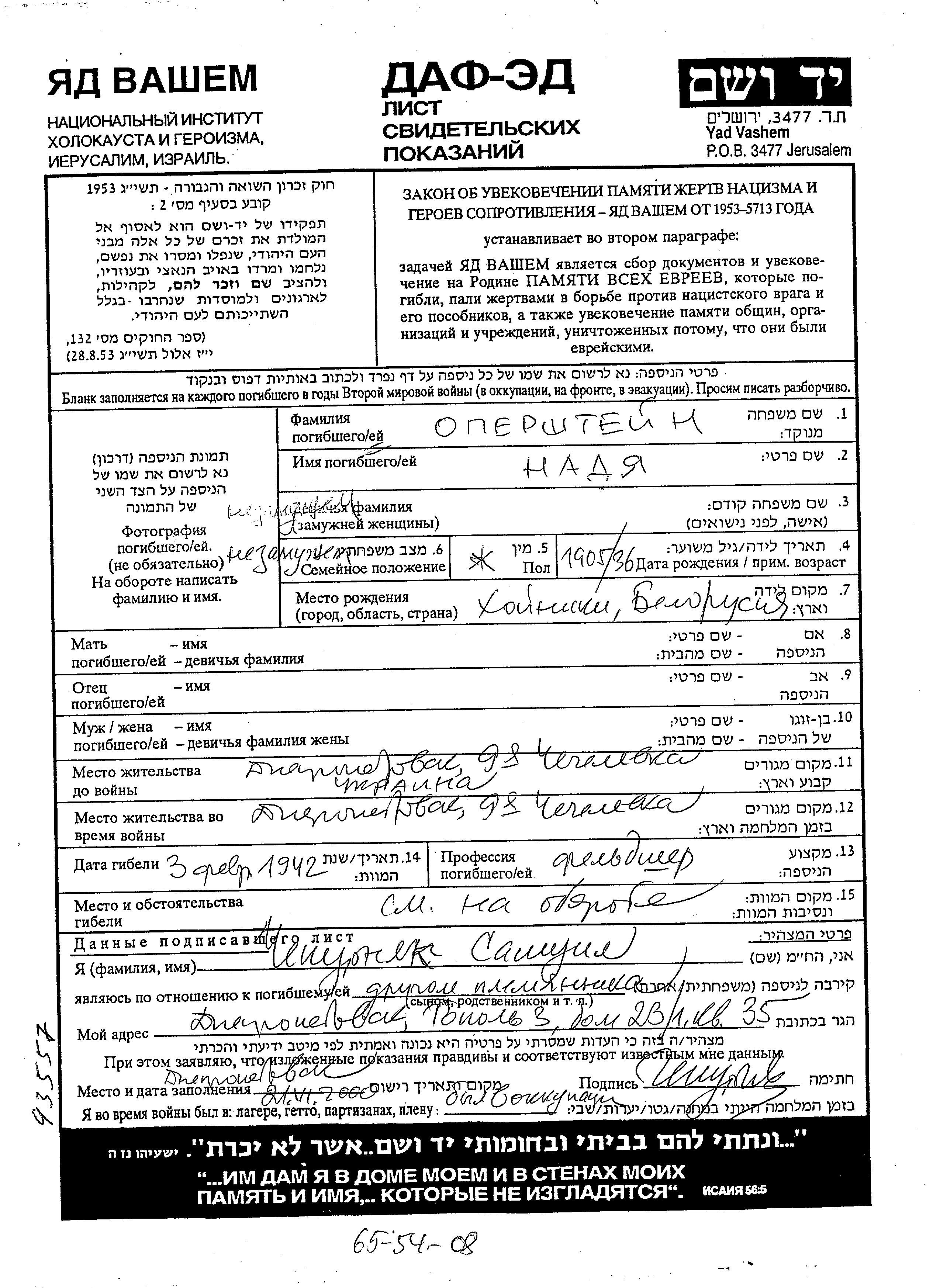 Opershtein Nadya 1905 Dnepropetrovsk, Ukraine (URSS) Feuille de témoignage