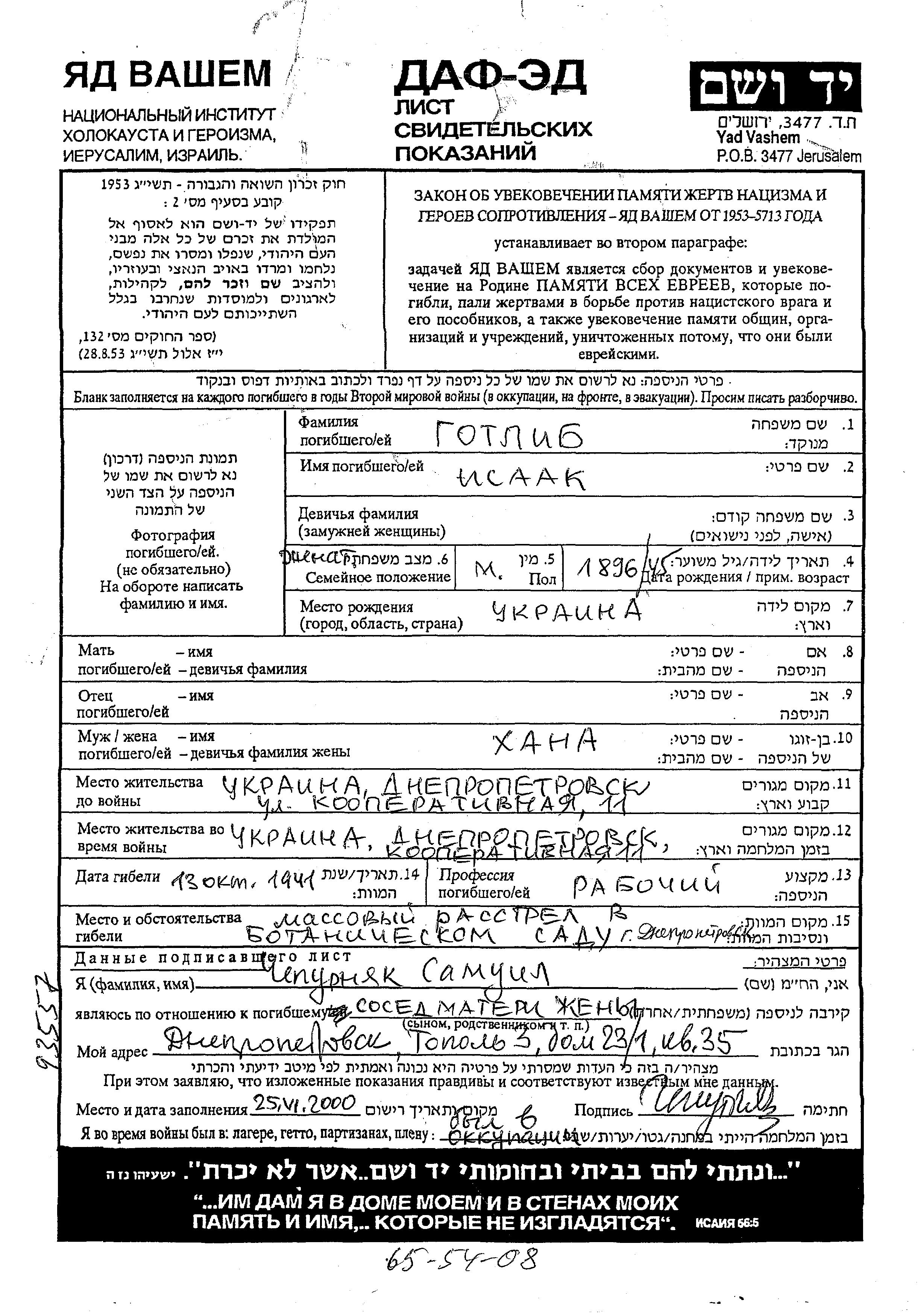 Gotlib Isaak 1896 Dnepropetrovsk, Ukraine (URSS) Feuille de témoignage