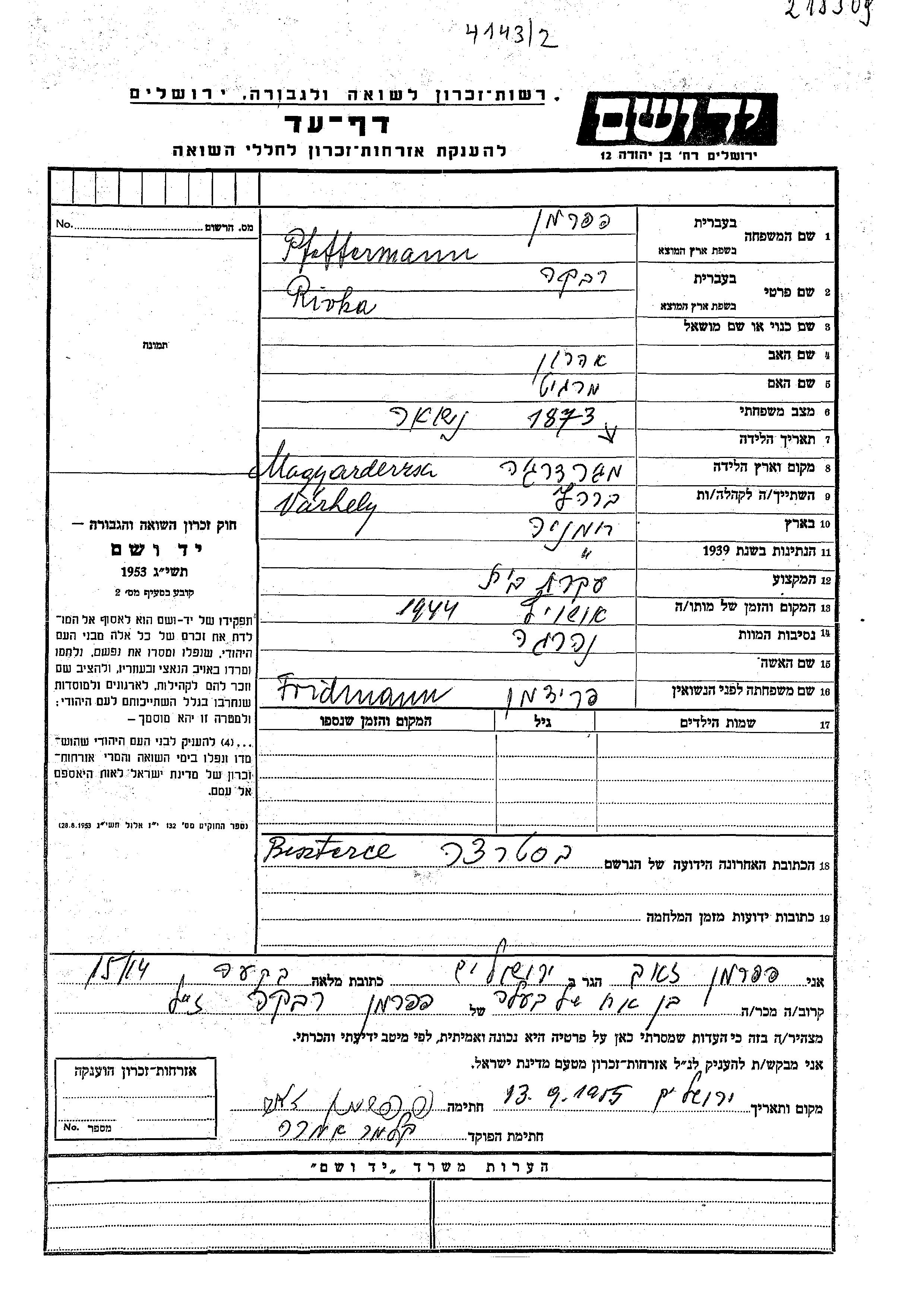 Pfefferman Rivka 1873 Varhely, Tchécoslovaquie Feuille de témoignage