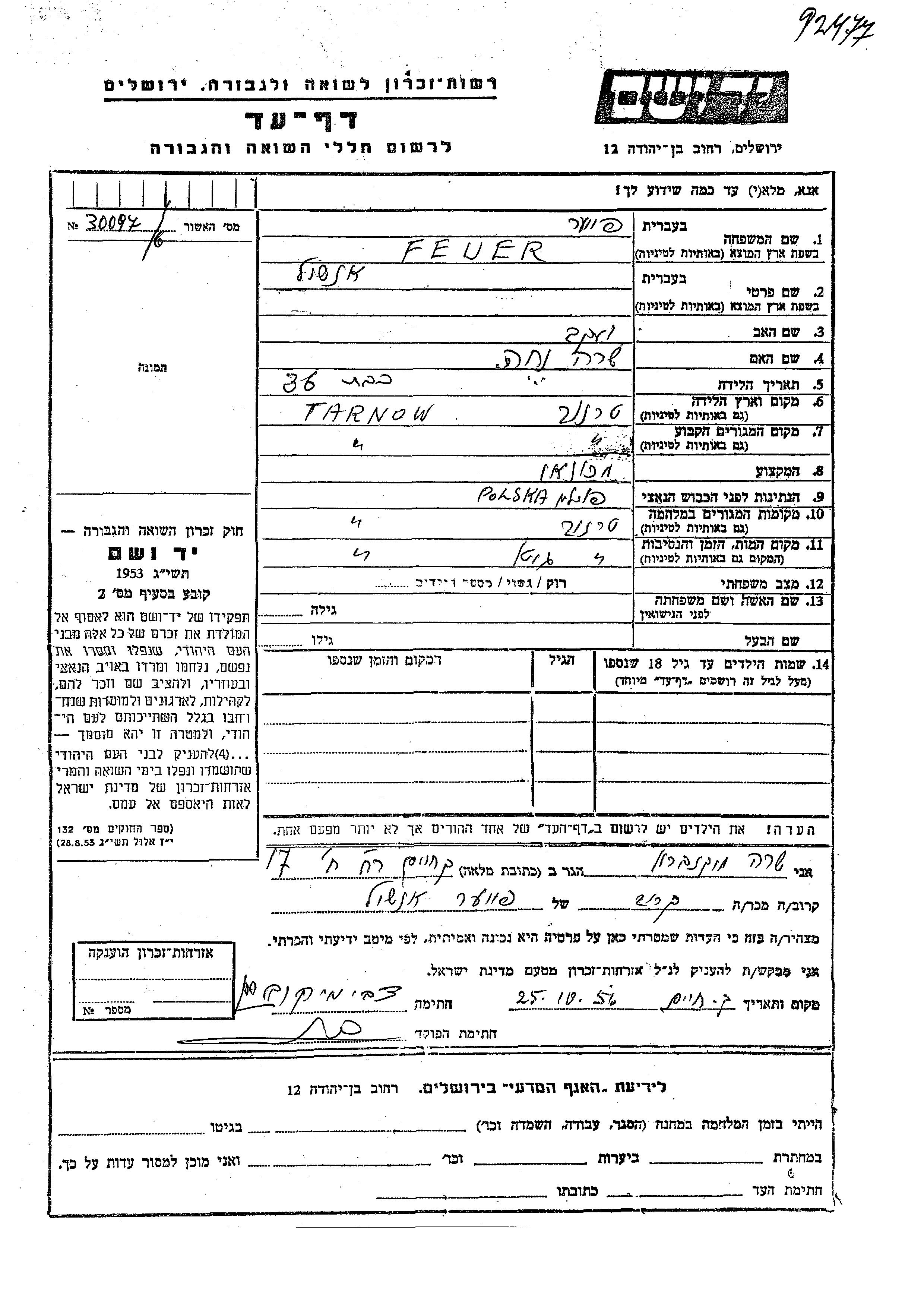 Anshil Feuer est né à Tarnow, Pologne, fils de Yaakov et de Sara Nekha. Il était Mécanicien. Avant la seconde guerre mondiale il vivait à Tarnow, Pologne. Au cours de la guerre, il était à Tarnow, Pologne.