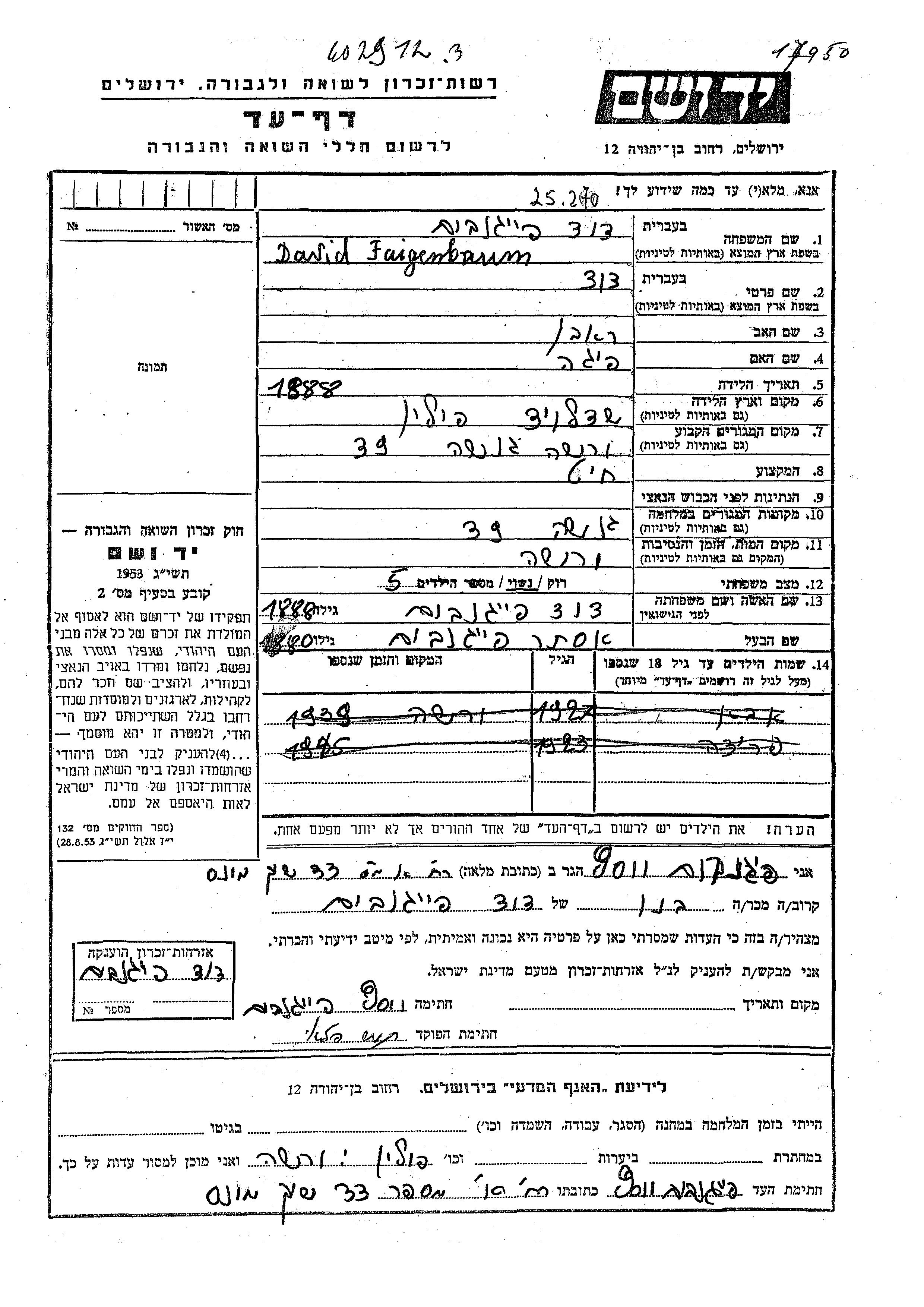 Faigenbaum David 1888 Warsaw, Pologne Feuille de témoignage