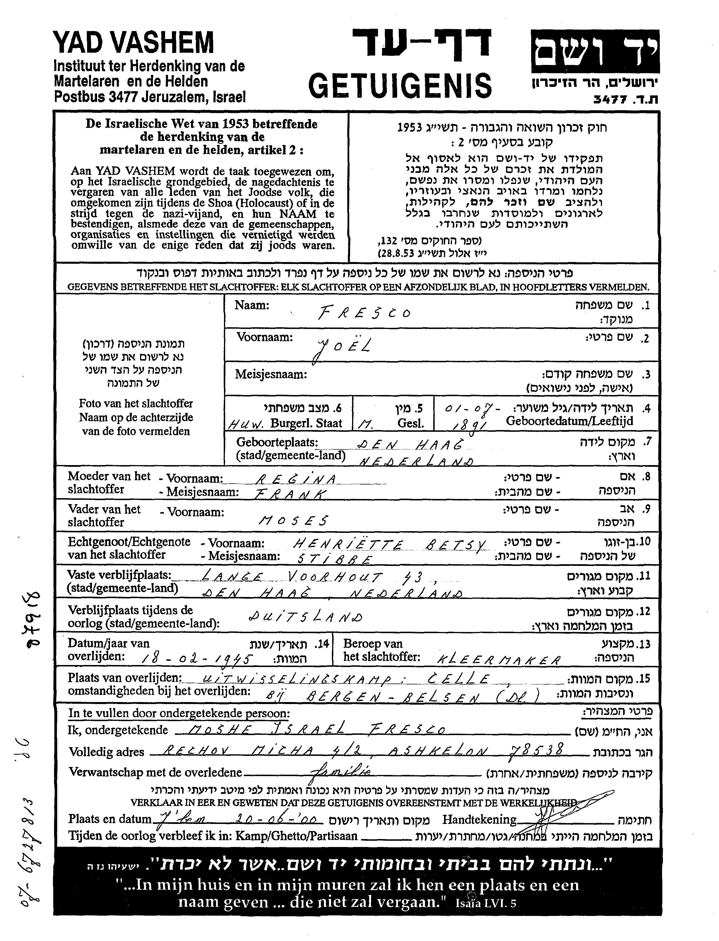 Joel Fresco est né à Haag, Pays-Bas en 1891, fils de Moses et de Regina. Il était Tailleur et Mariée à Henriette Betsy née Stibbe. Avant la seconde guerre mondiale il vivait à Haag, Pays-Bas. Au cours de la guerre, il était à Allemagne.