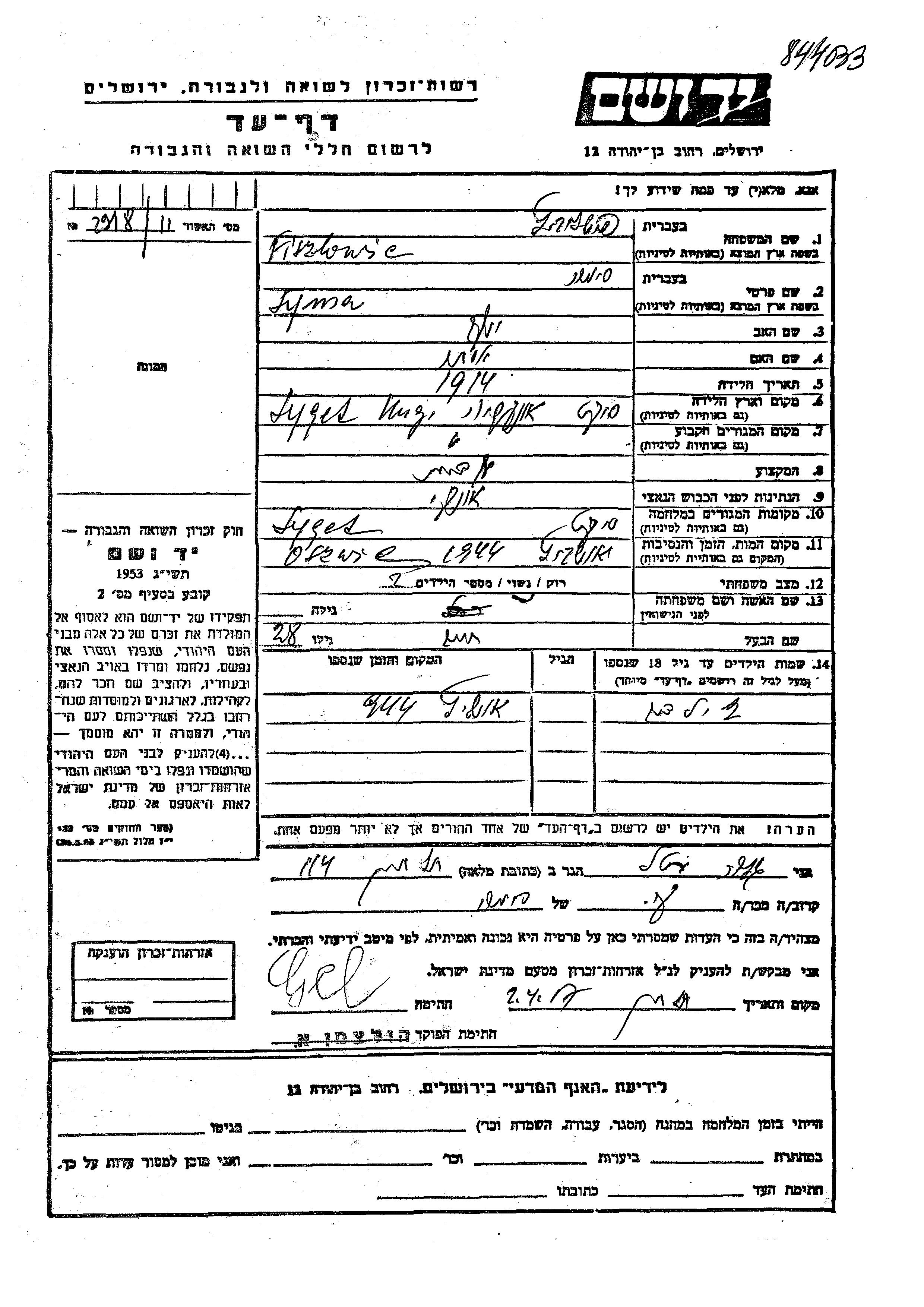 Fiszlowicz Syma 1914 Syged, Hongrie Feuille de témoignage