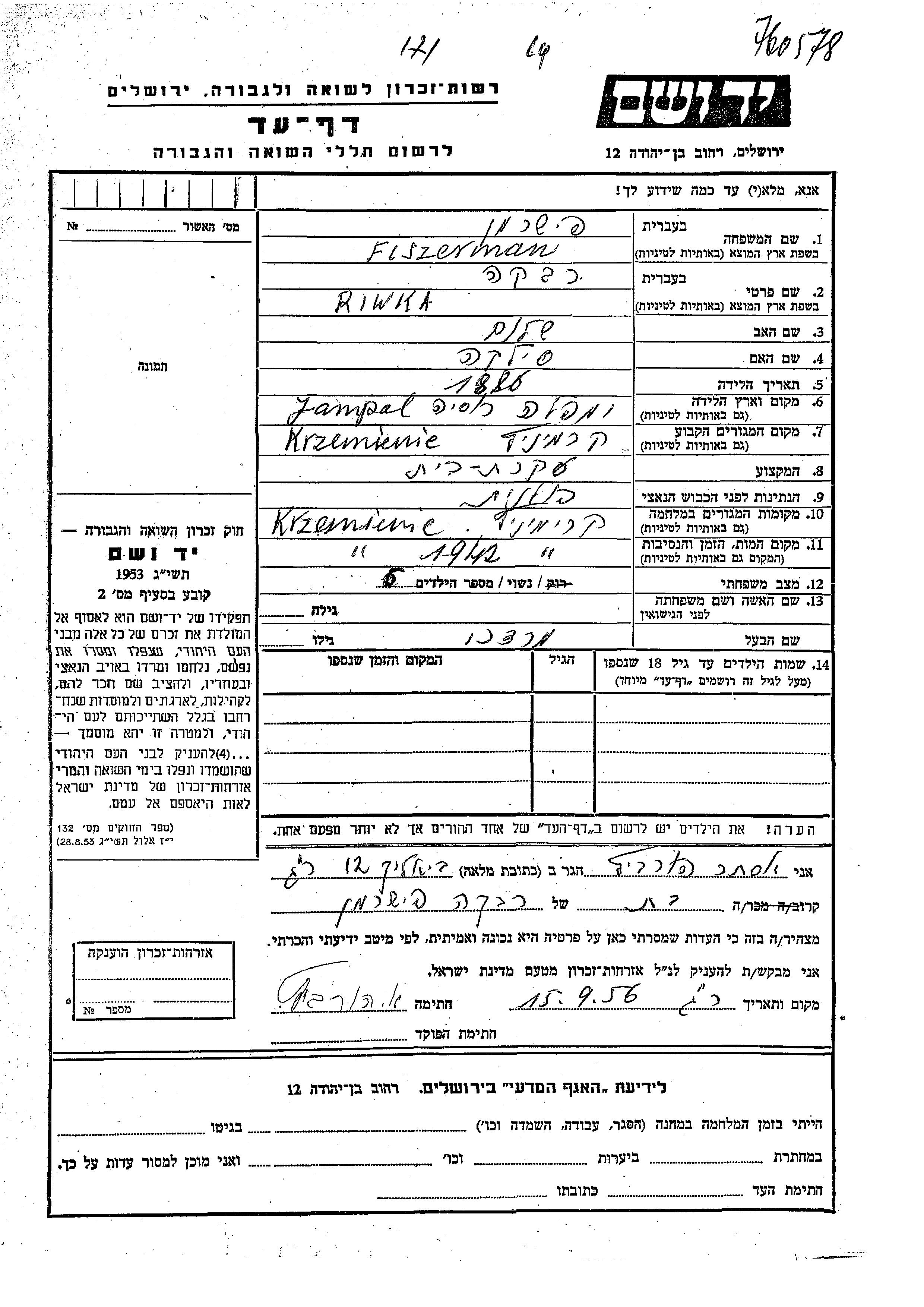 Fiszerman Riwka 1886 Krzemieniec, Pologne Feuille de témoignage