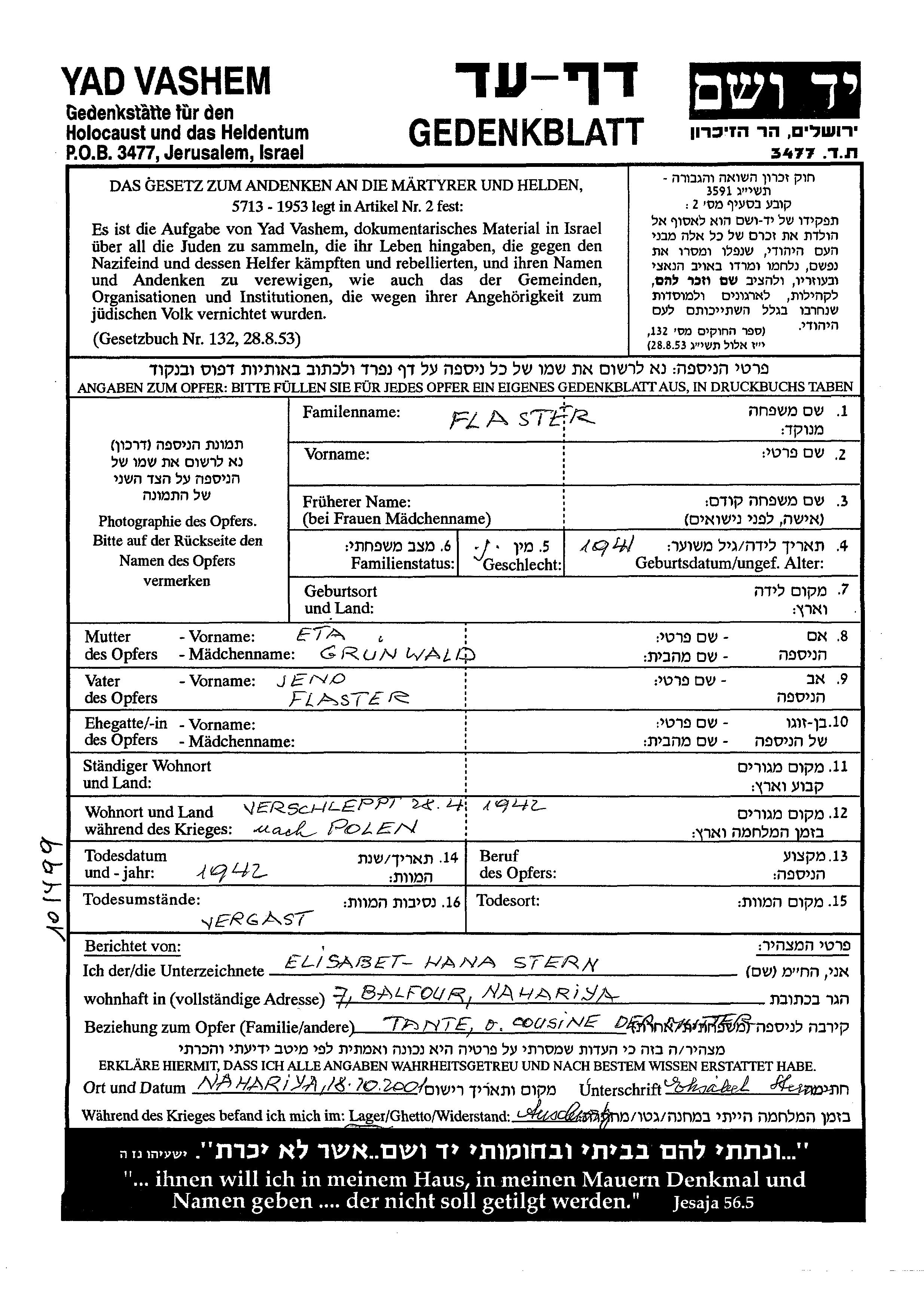 Flaster prénom inconnu 1941 endroit inconnu, Feuille de témoignage