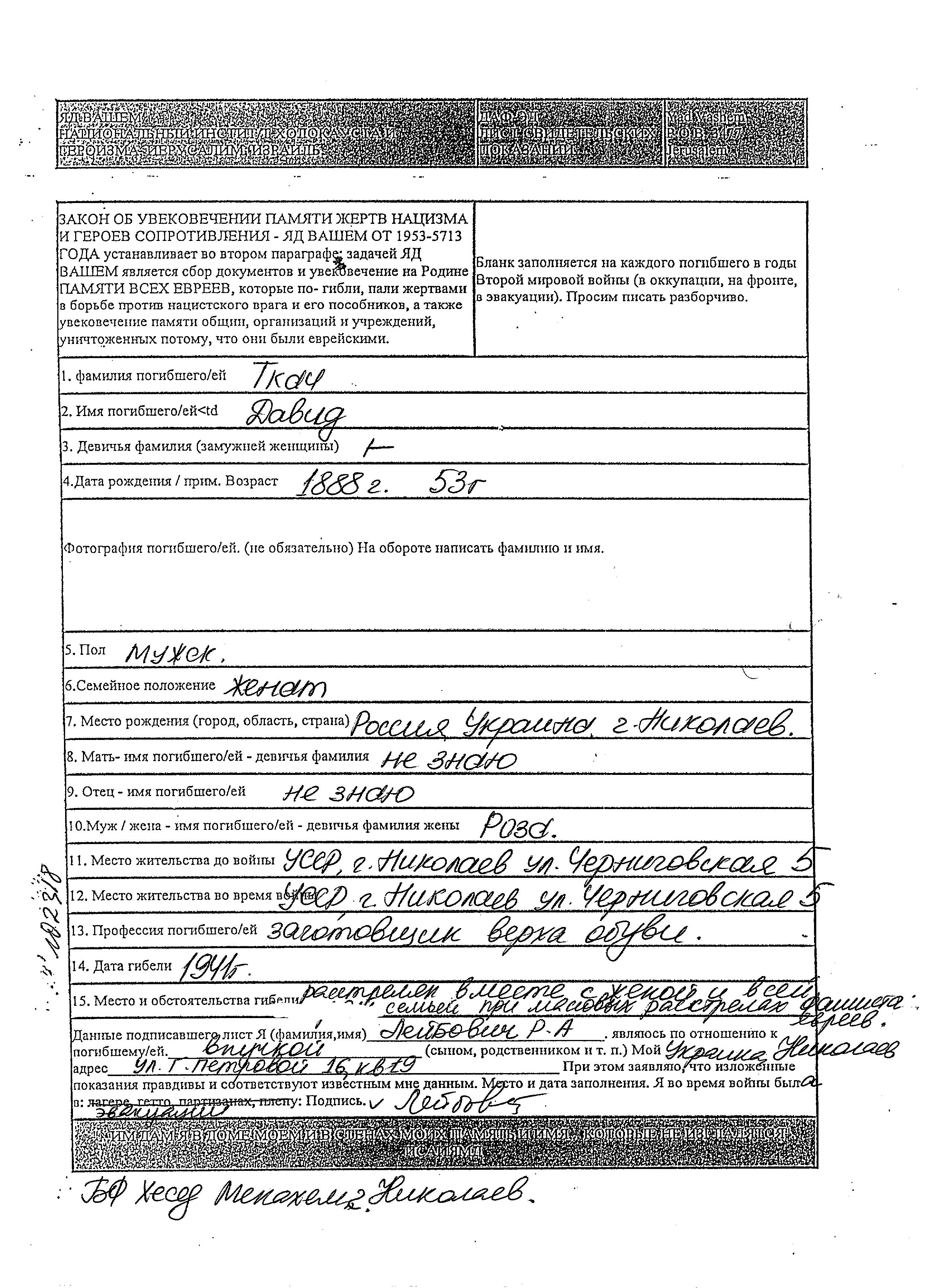 Tkach David 1888 Nikolayev, Ukraine (URSS) Feuille de témoignage