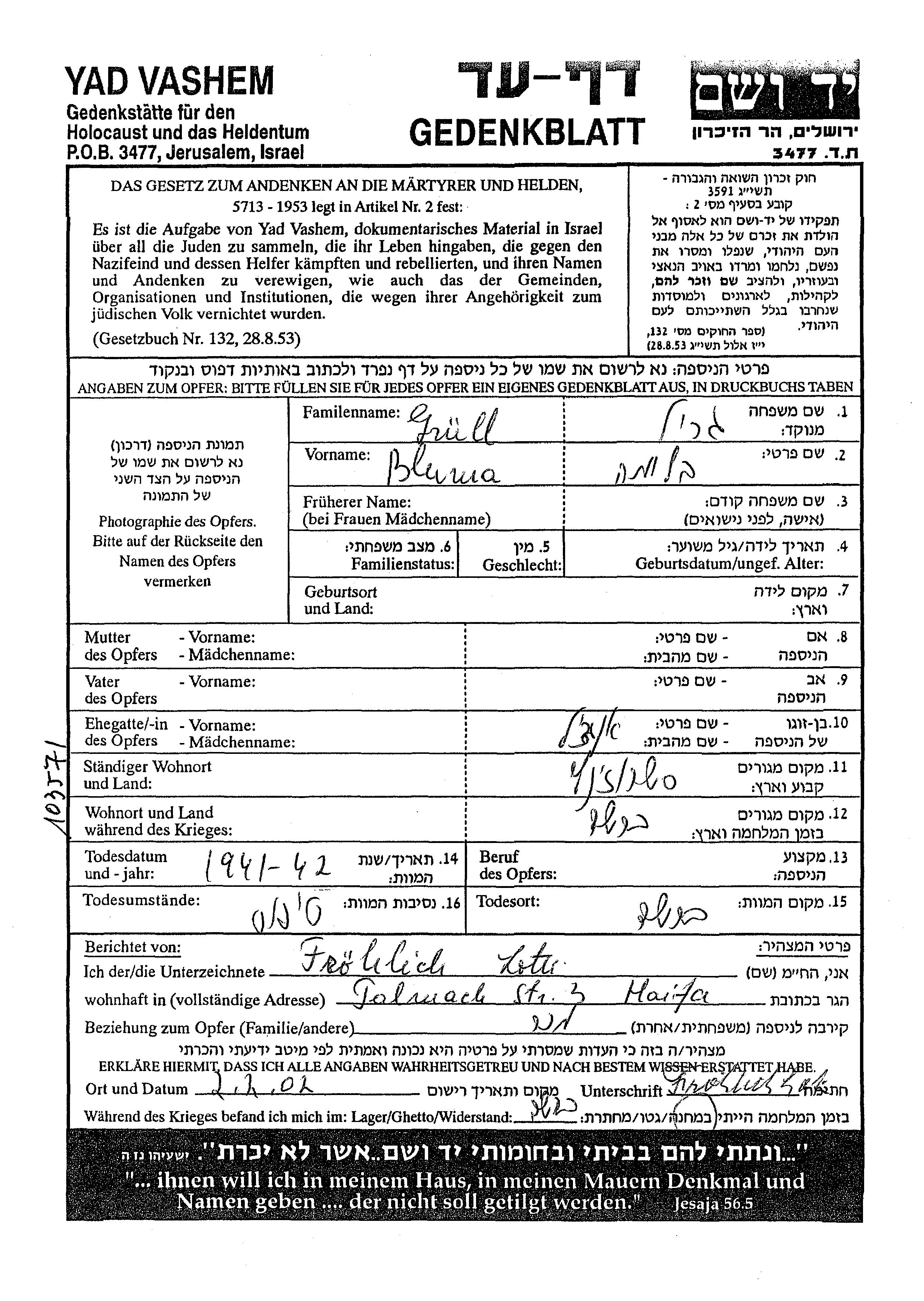 Bluma a été assassinée pendant la Shoah. Lieu de la mort: endroit inconnu en 1941.