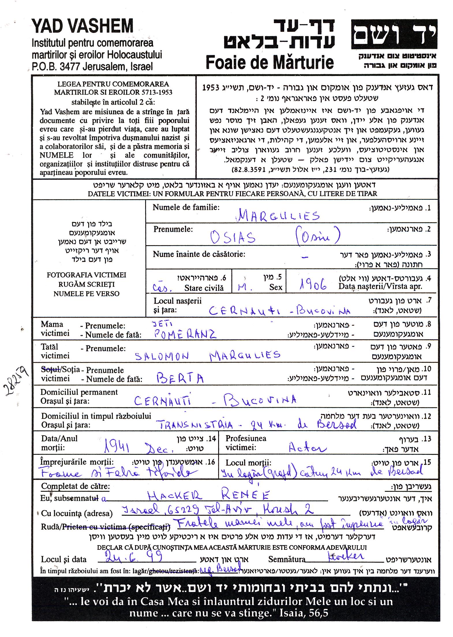 Osias Osiu Margulies est né à Cernauti, Roumanie en 1906, fils de Salomon et de Jeti née Pomeranz. Il était Comédien et Mariée à Berta. Avant la seconde guerre mondiale il vivait à Cernauti, Roumanie. Au cours de la guerre, il était à Transnistria, Ukraine (URSS).