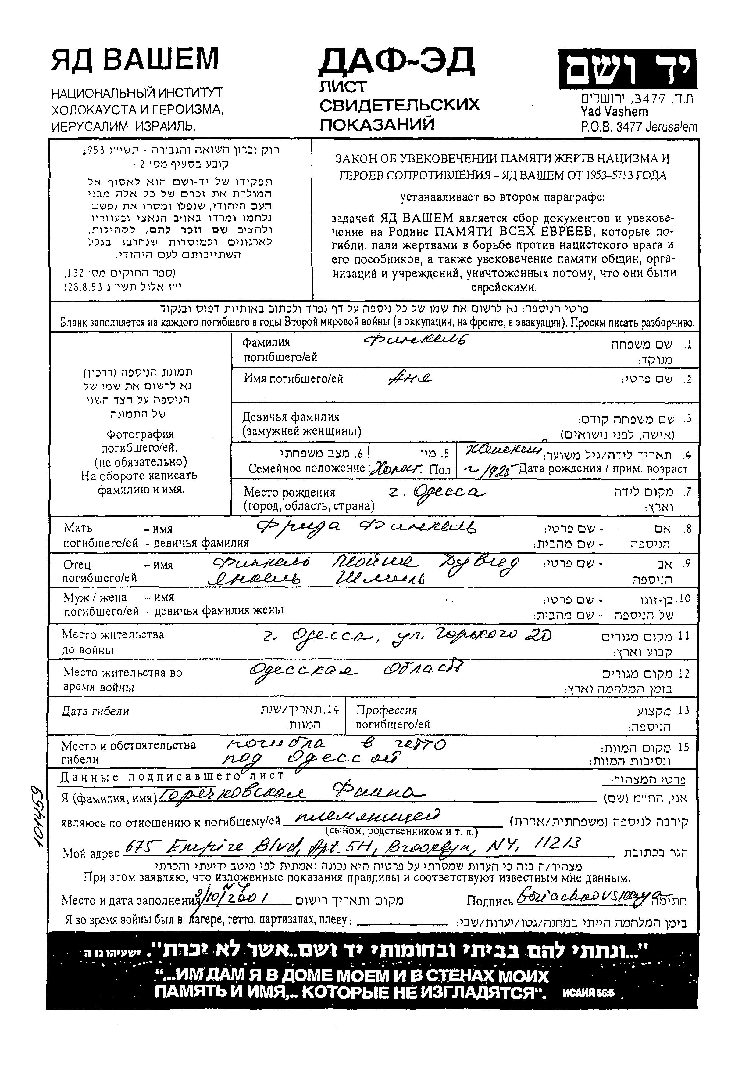 Finkel Anya 1925 Odessa, Ukraine (URSS) Feuille de témoignage