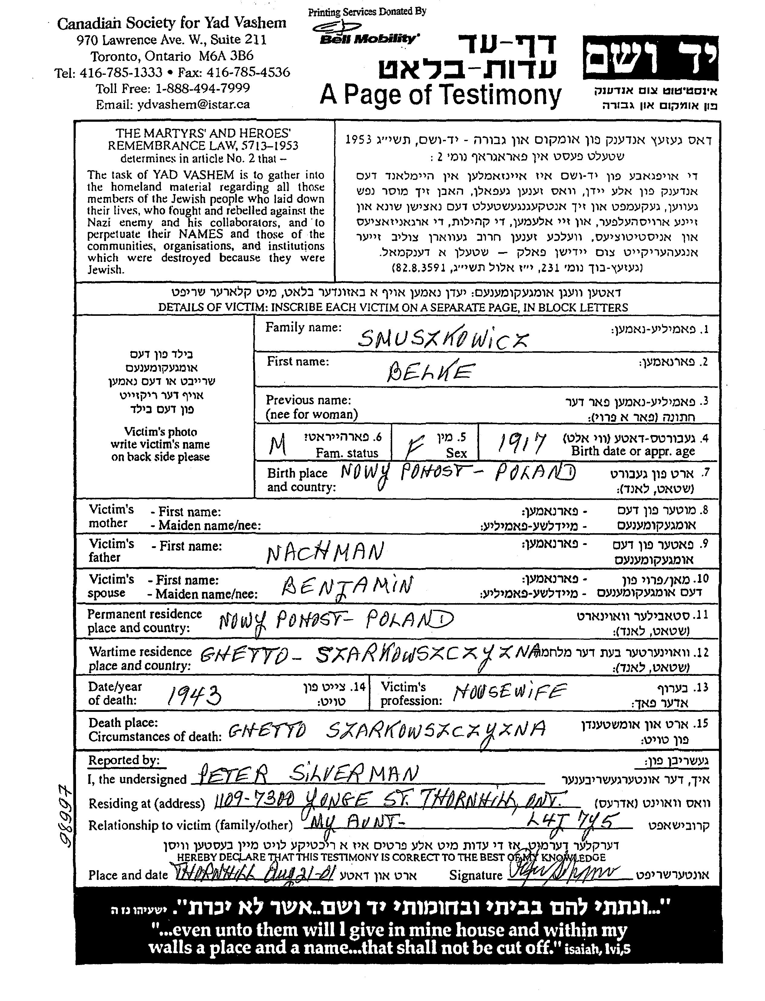 Belke Smuszkowicz est née à Nowy Pohost, Pologne en 1917, fille de Nachman. Elle était Femme au foyer et Mariée à Benjamin. Avant la seconde guerre mondiale elle vivait à Nowy Pohost, Pologne. Pendant la guerre, elle était à Szarkowszczyzna, Pologne.