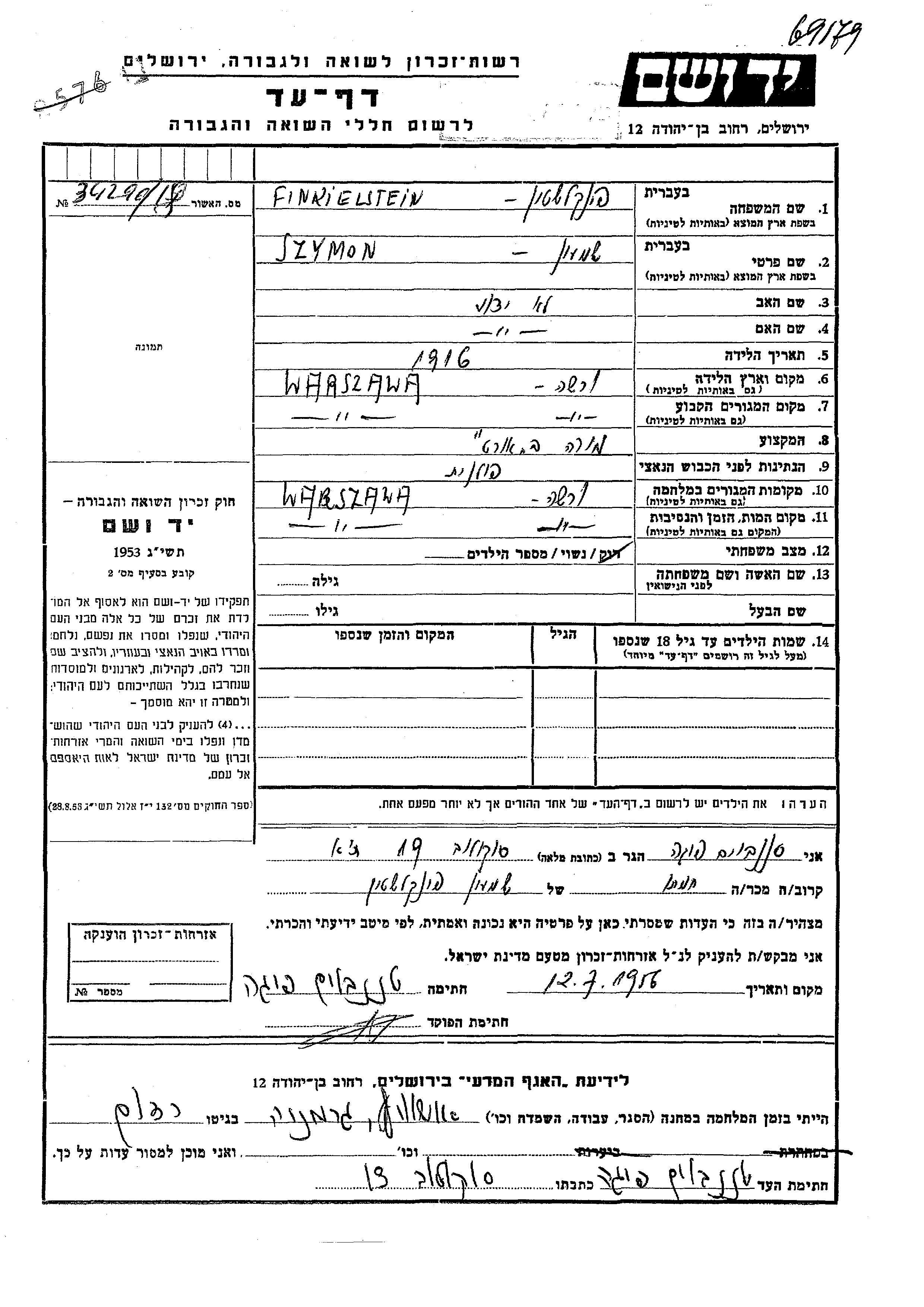 Finkelstein Szymon 1916 Warsaw, Pologne Feuille de témoignage