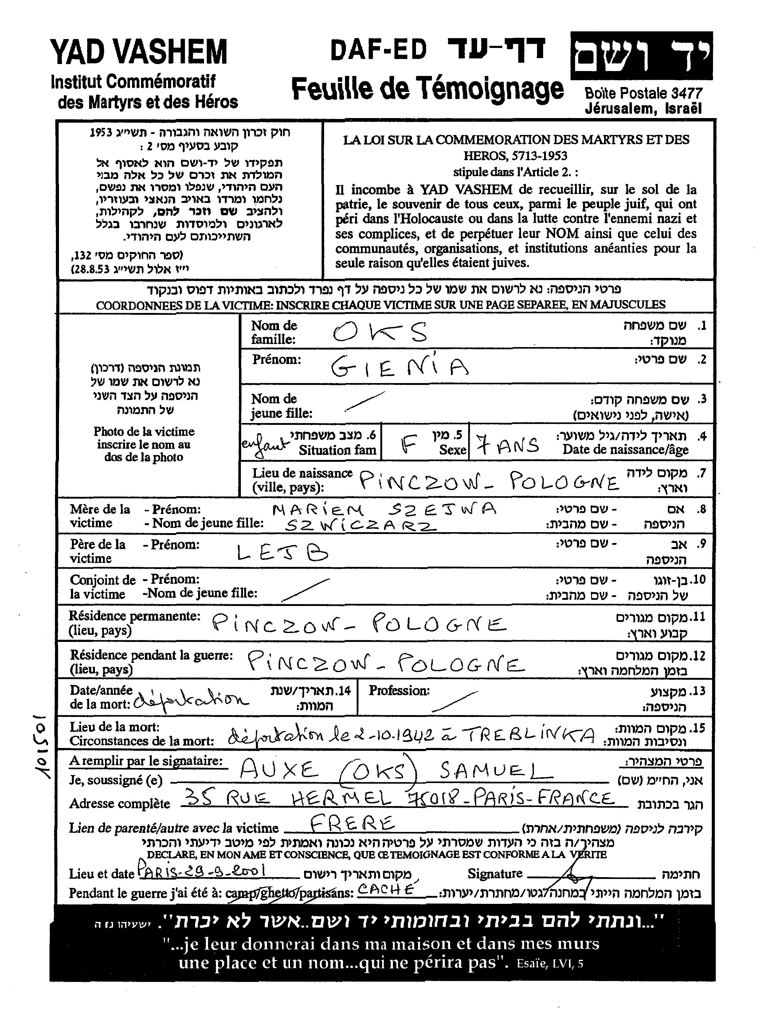 Oks Gienia Pinczow, Pologne Feuille de témoignage