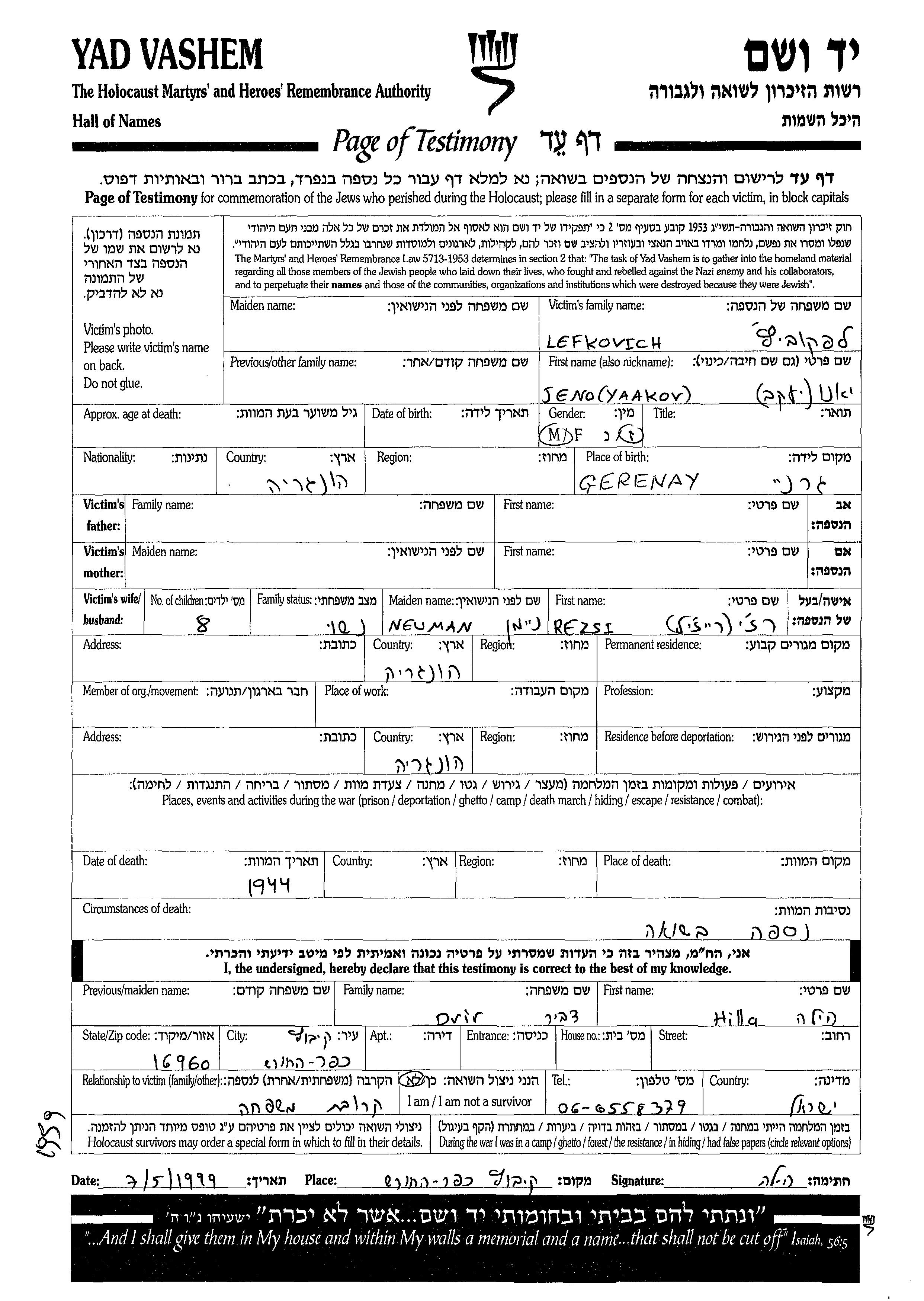Jeno Yaakov Lefkovitch est né à Gereny, Tchécoslovaquie. Il était Mariée à Rezsi Reizil née Neuman. Avant la seconde guerre mondiale il vivait à Hongrie. Au cours de la guerre, il était à Hongrie.