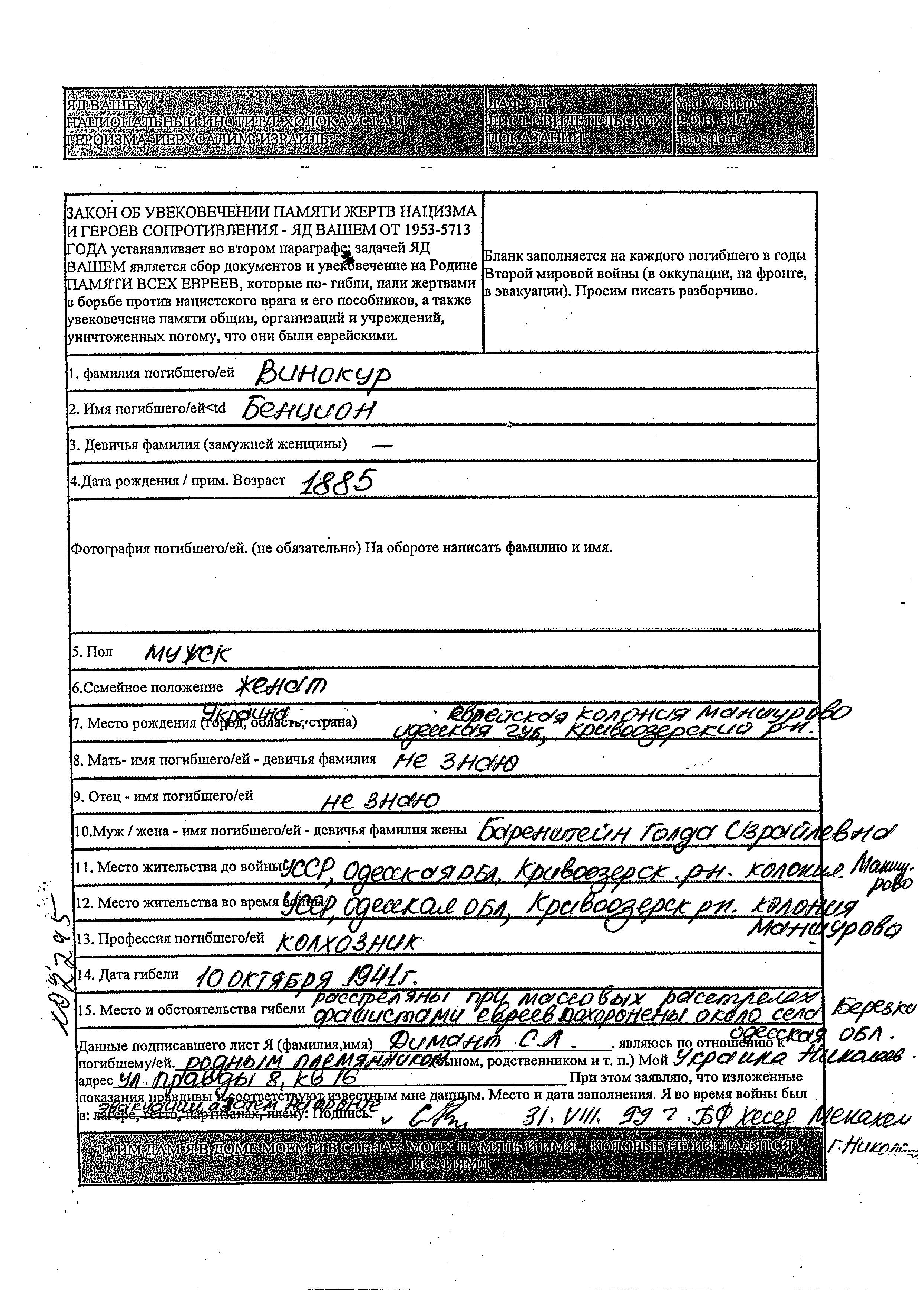 Vinokur Bentzion 1885 Manzhurovo, Ukraine (URSS) Feuille de témoignage