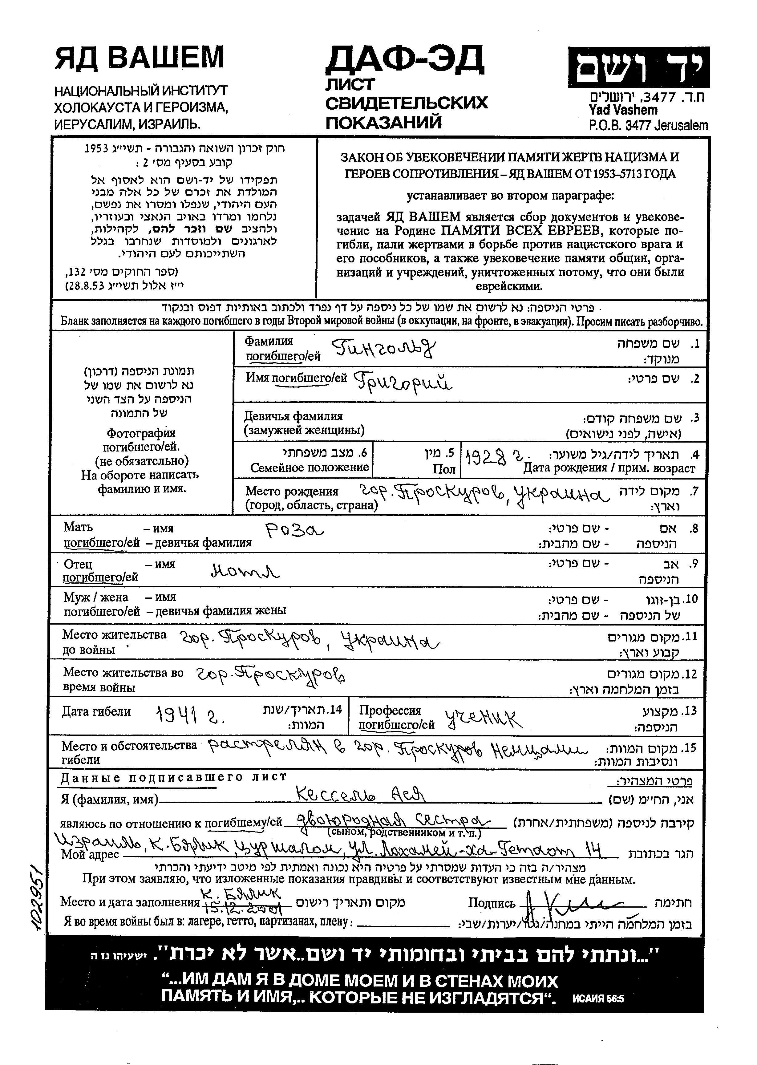 Gingold Grigori 1928 Proskurov, Ukraine (URSS) Feuille de témoignage