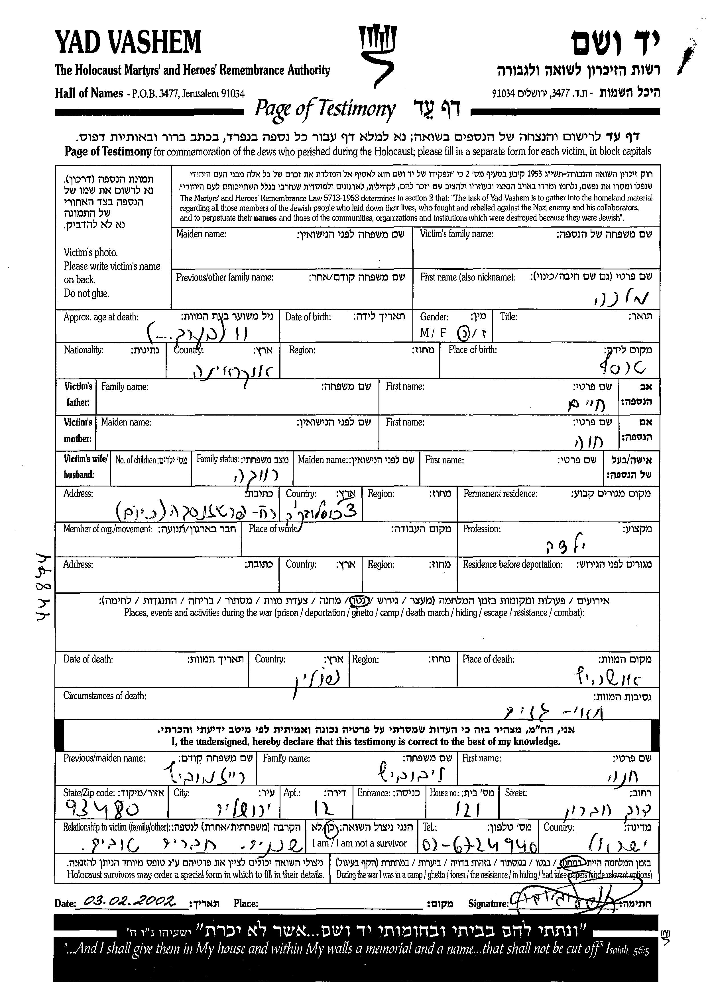 Yad Vashem - Pages of Testimony Names Memorial Collection