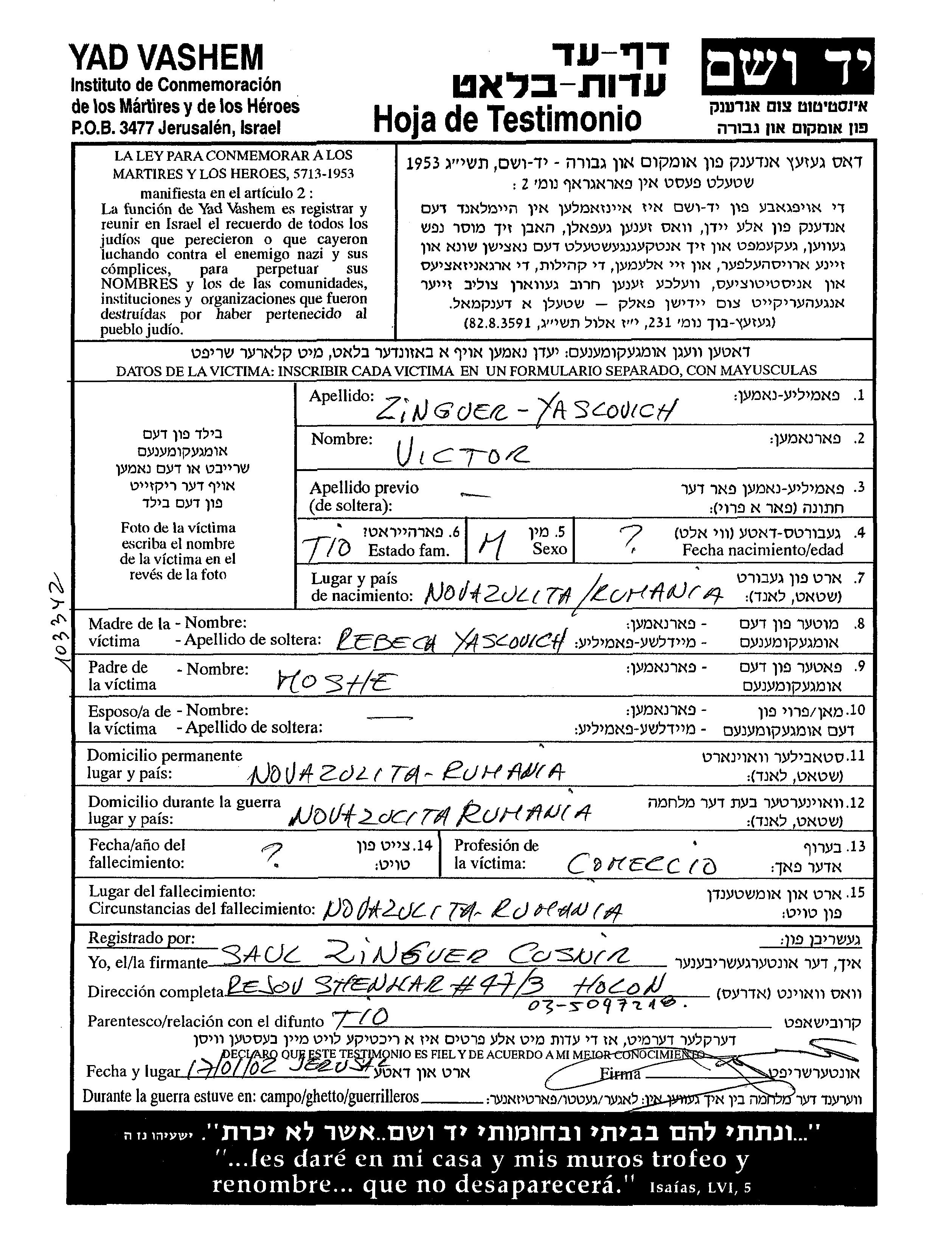 Zinguer Yascovich Victor Noua Sulita, Roumanie Feuille de témoignage