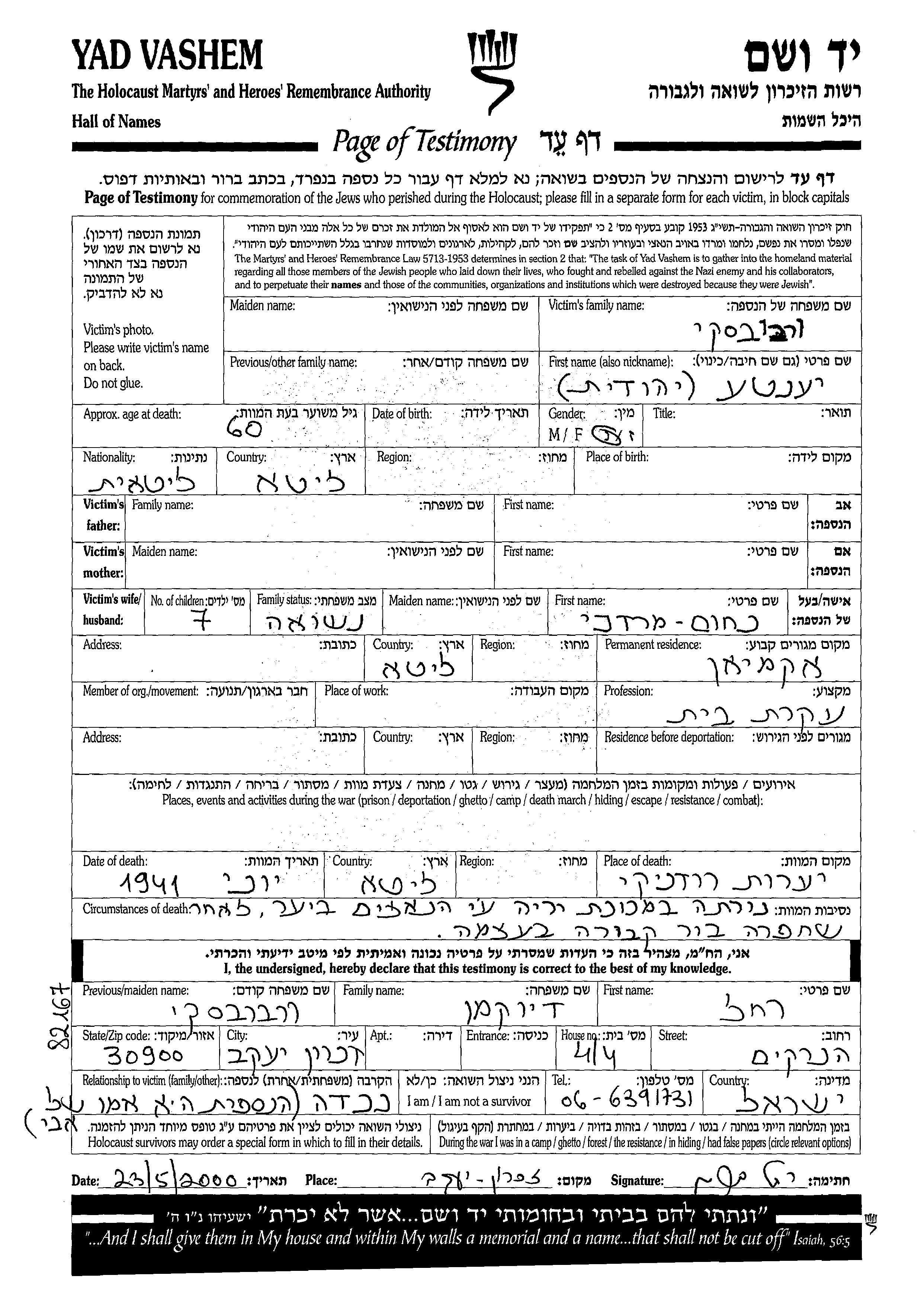 Yad Vashem - Pages of Testimony Names Memorial Collection
