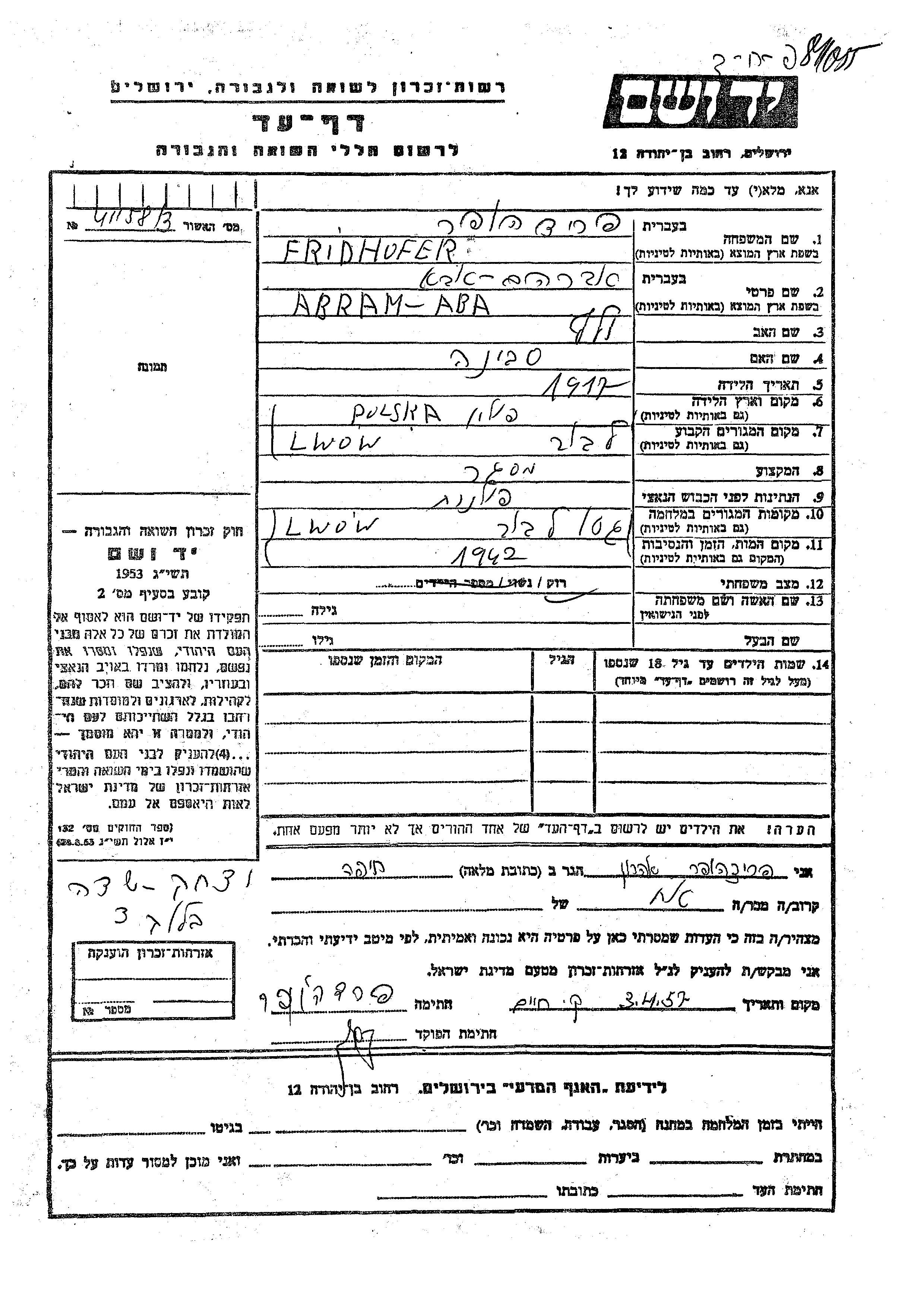 Fridhofer Abram Aba 1917 Lwow, Pologne Feuille de témoignage