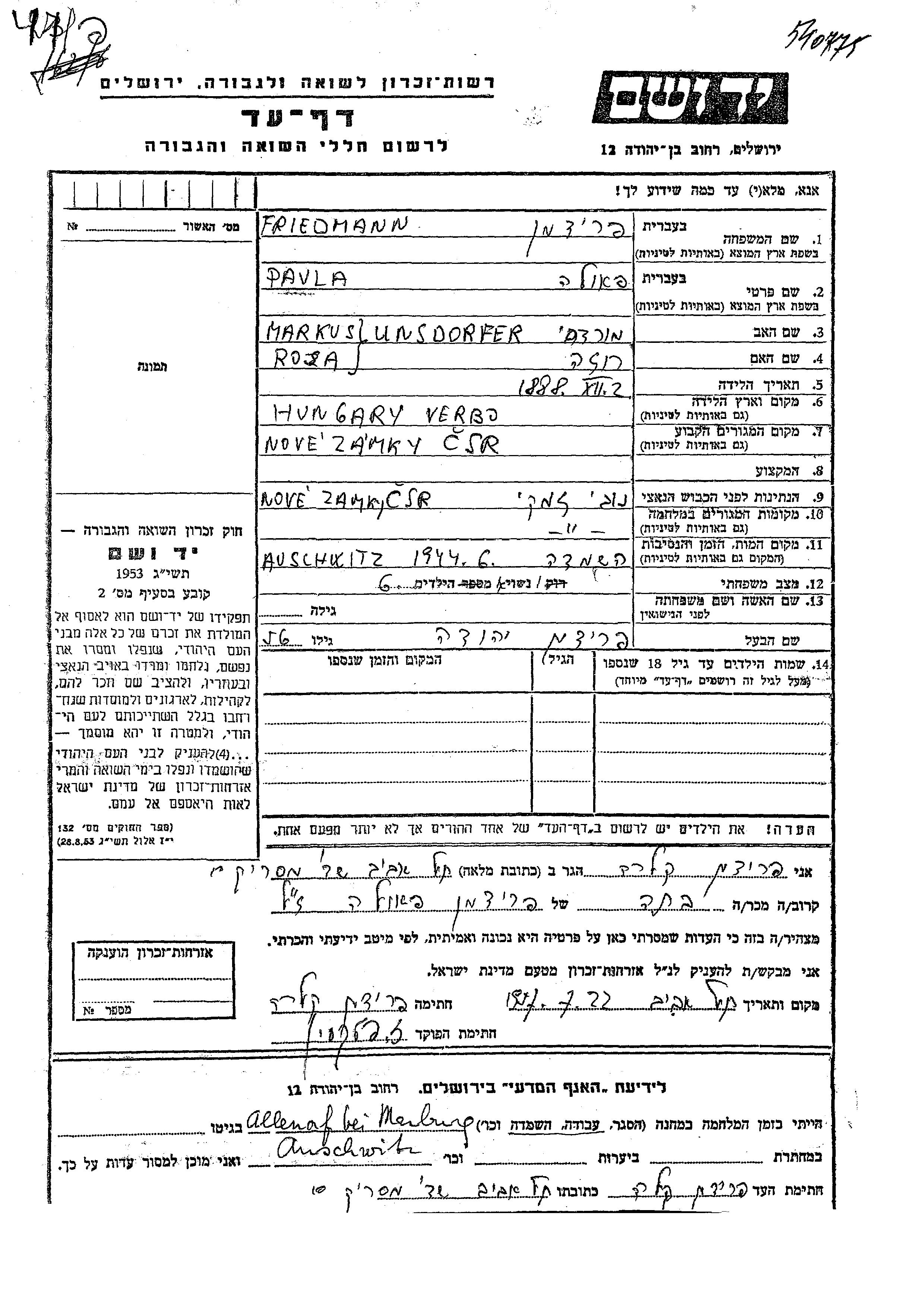 Paula Friedmann née Unsdorfer est née à Verbo, Tchécoslovaquie en 1888, fille de Mordechai Markus et de Roza. Elle était Mariée à Yehuda. Avant la seconde guerre mondiale elle vivait à Nove Zamky, Tchécoslovaquie. Pendant la guerre, elle était à Nove Zamky, Tchécoslovaquie.