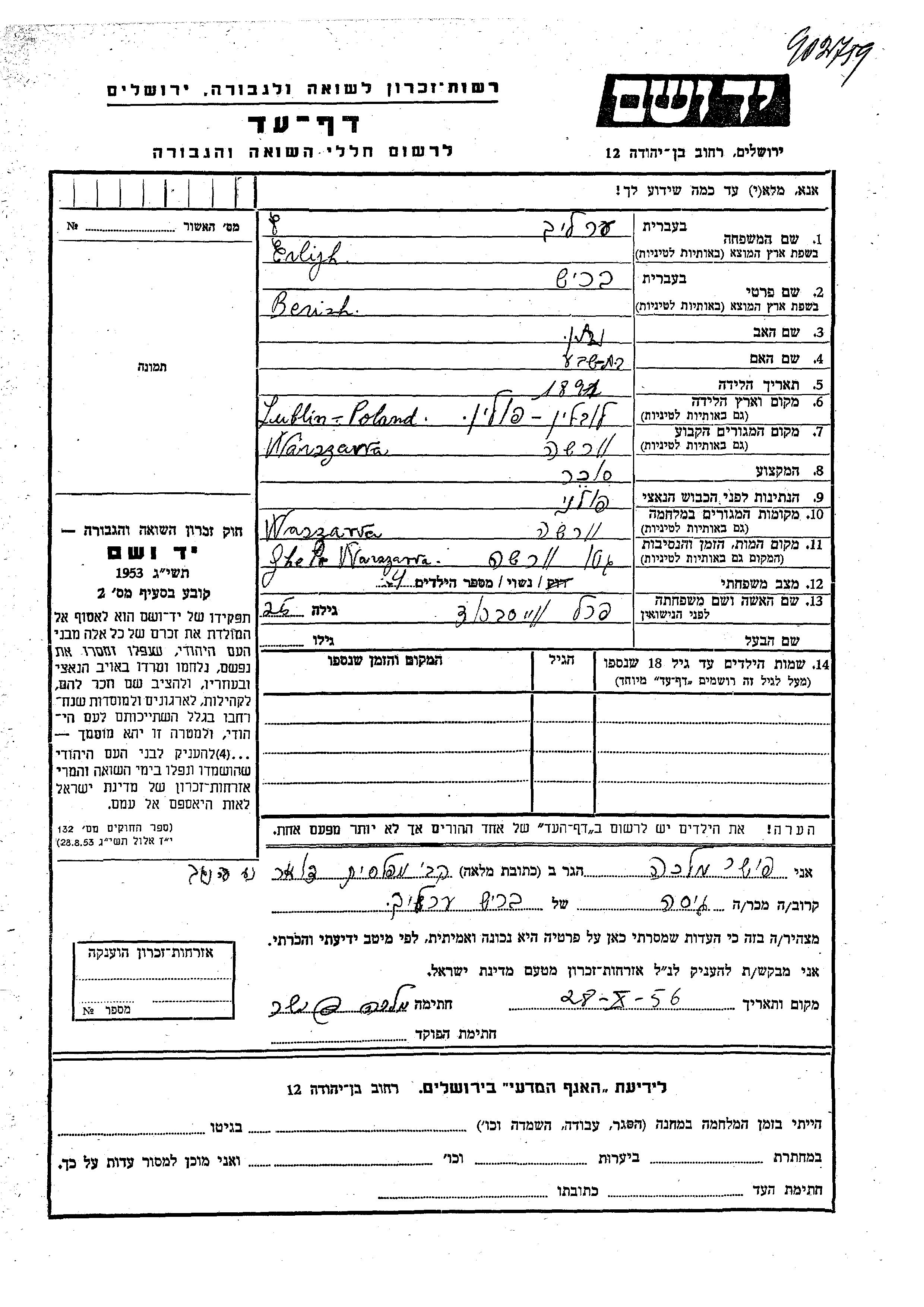 Erlijh Berish 1891 Warszawa, Pologne Feuille de témoignage