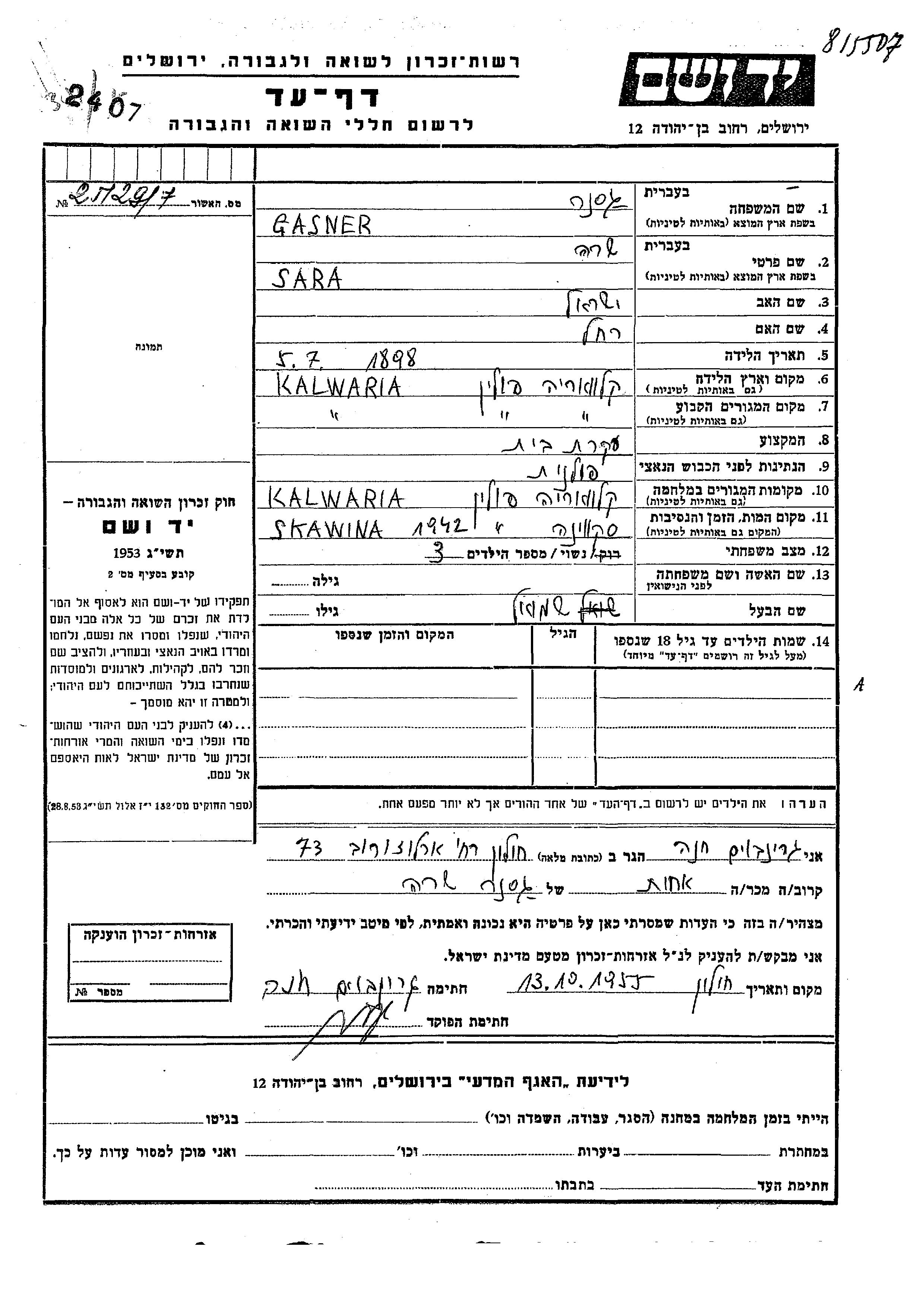 Gasner Sara 1898 Kalwaria, Pologne Feuille de témoignage
